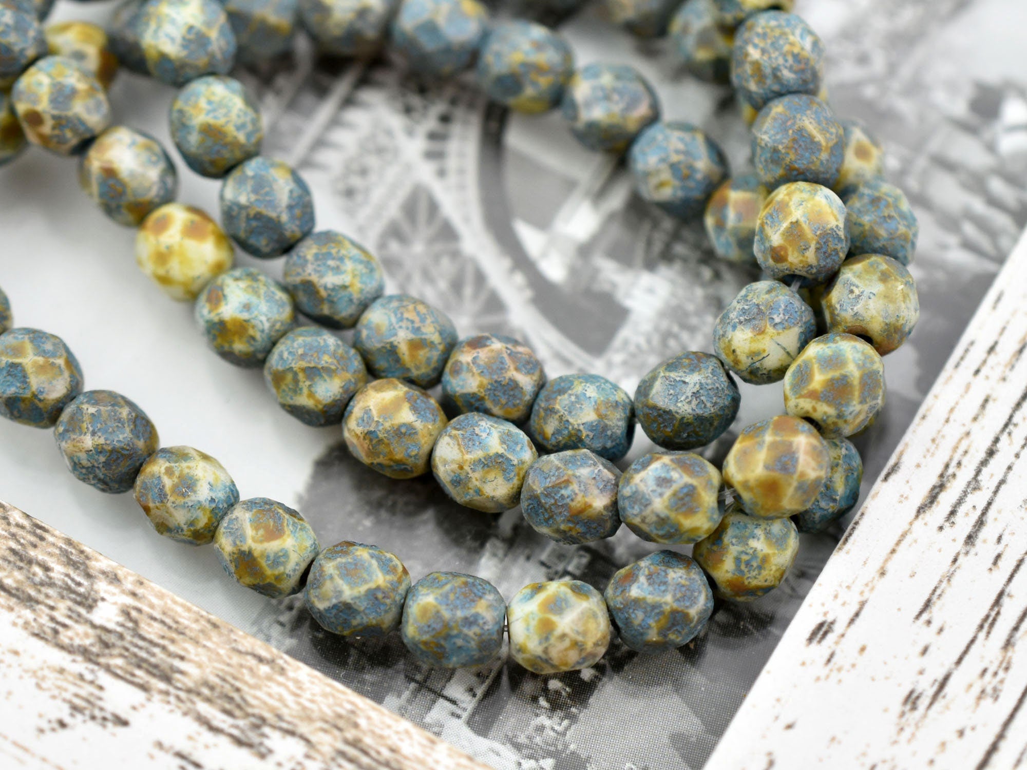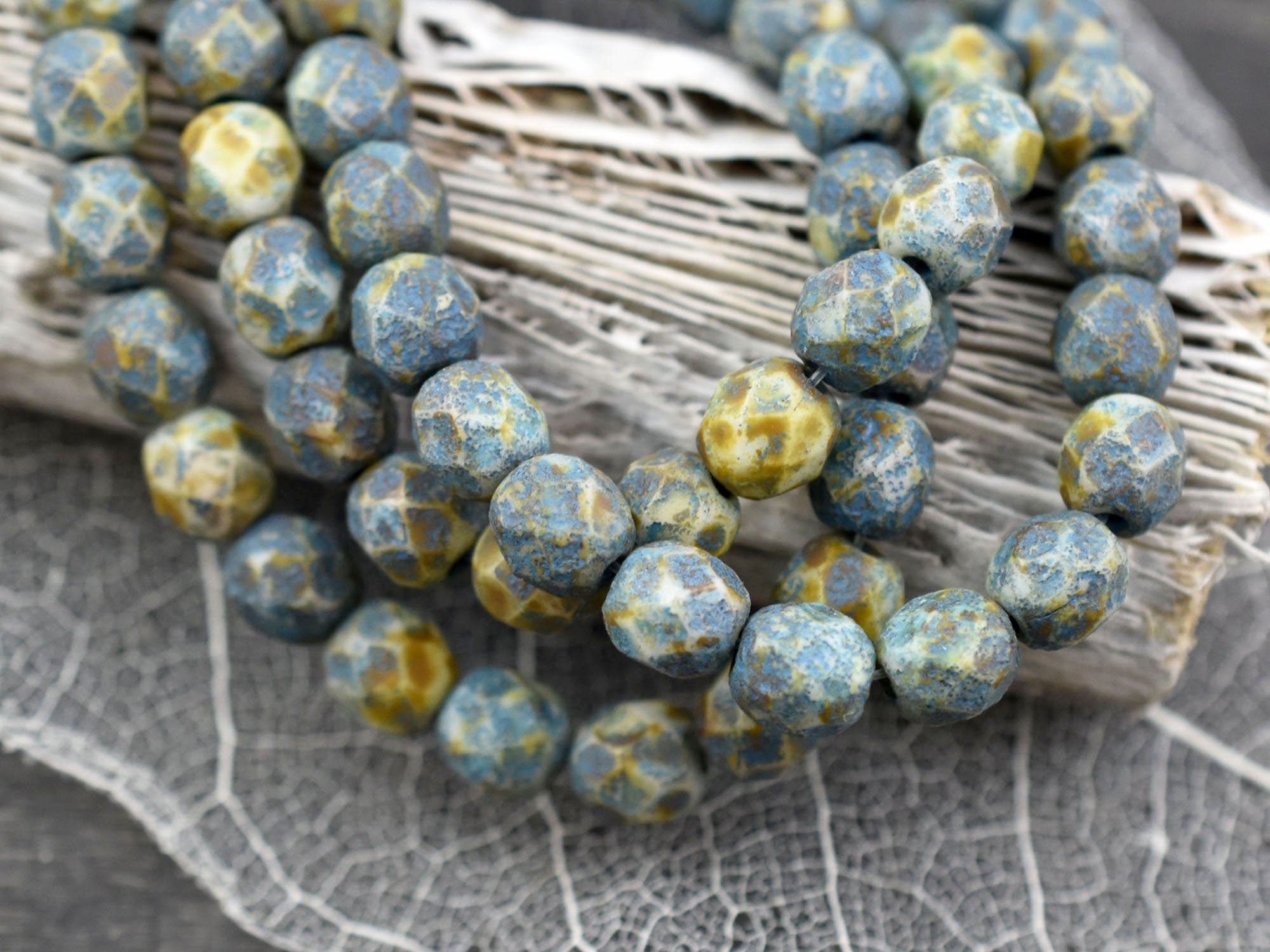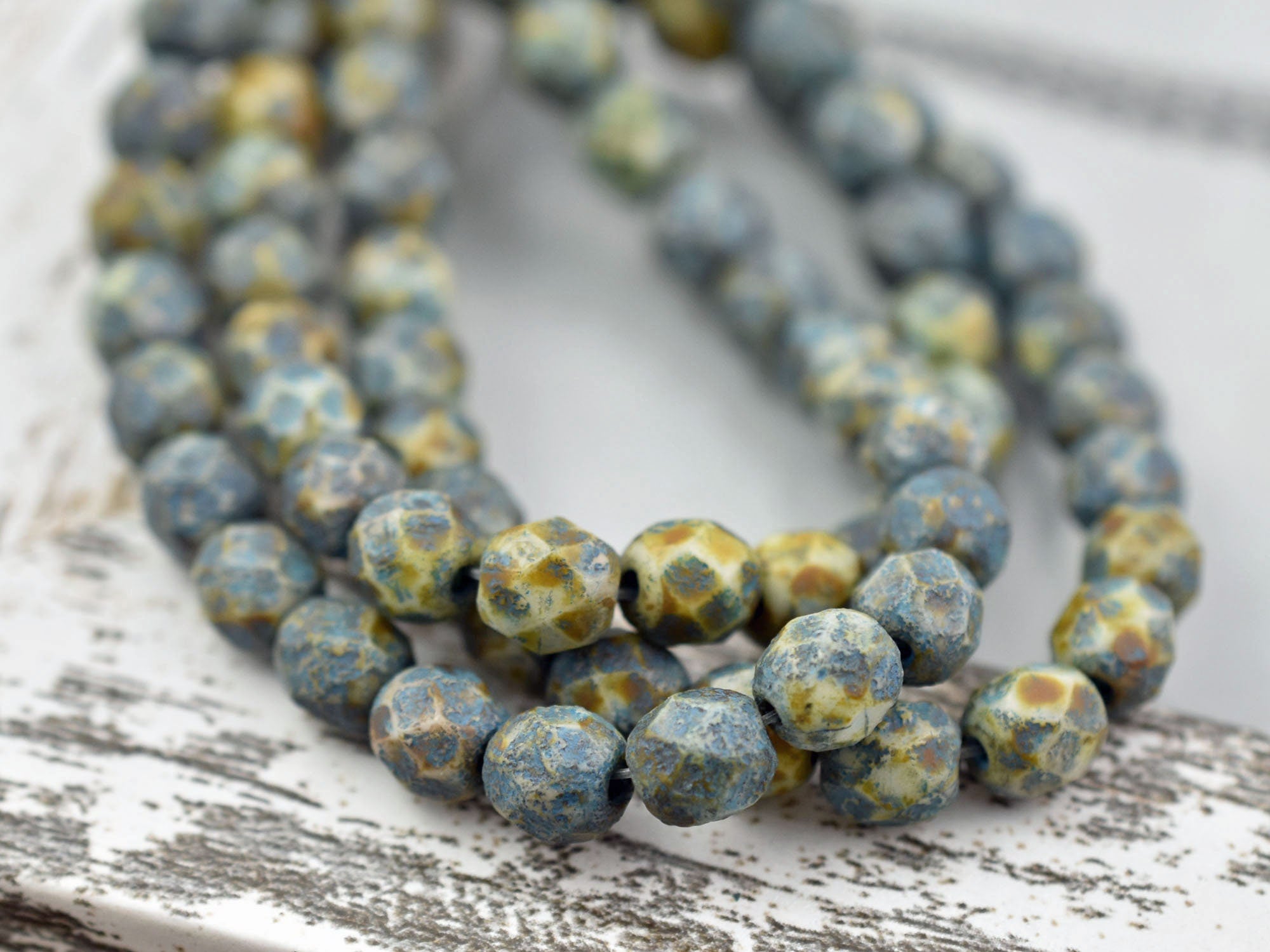 Etched Turquoise Washed Honey Beige Picasso Fire Polished Round Beads -- Choose Your Size