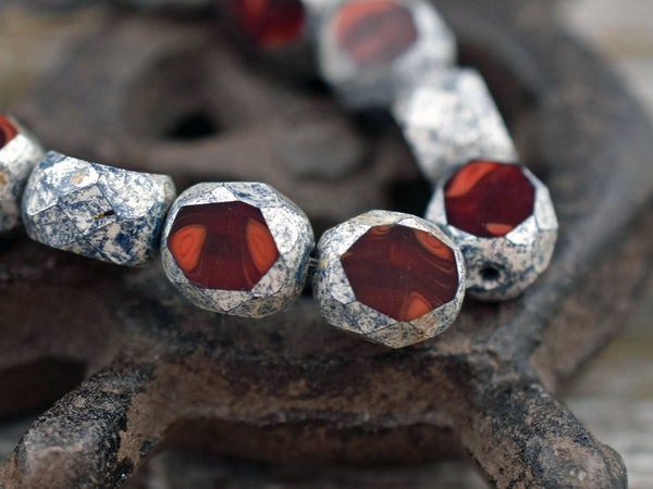 *15* 8mm Antique Silver Washed Lady Bug Red 2 Cut Fire Polished Faceted Round Beads
