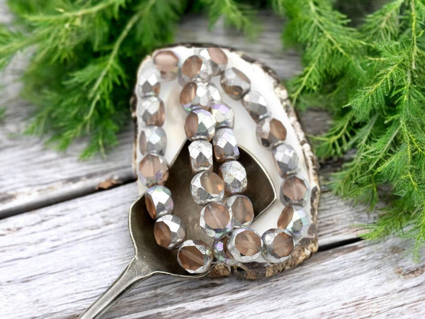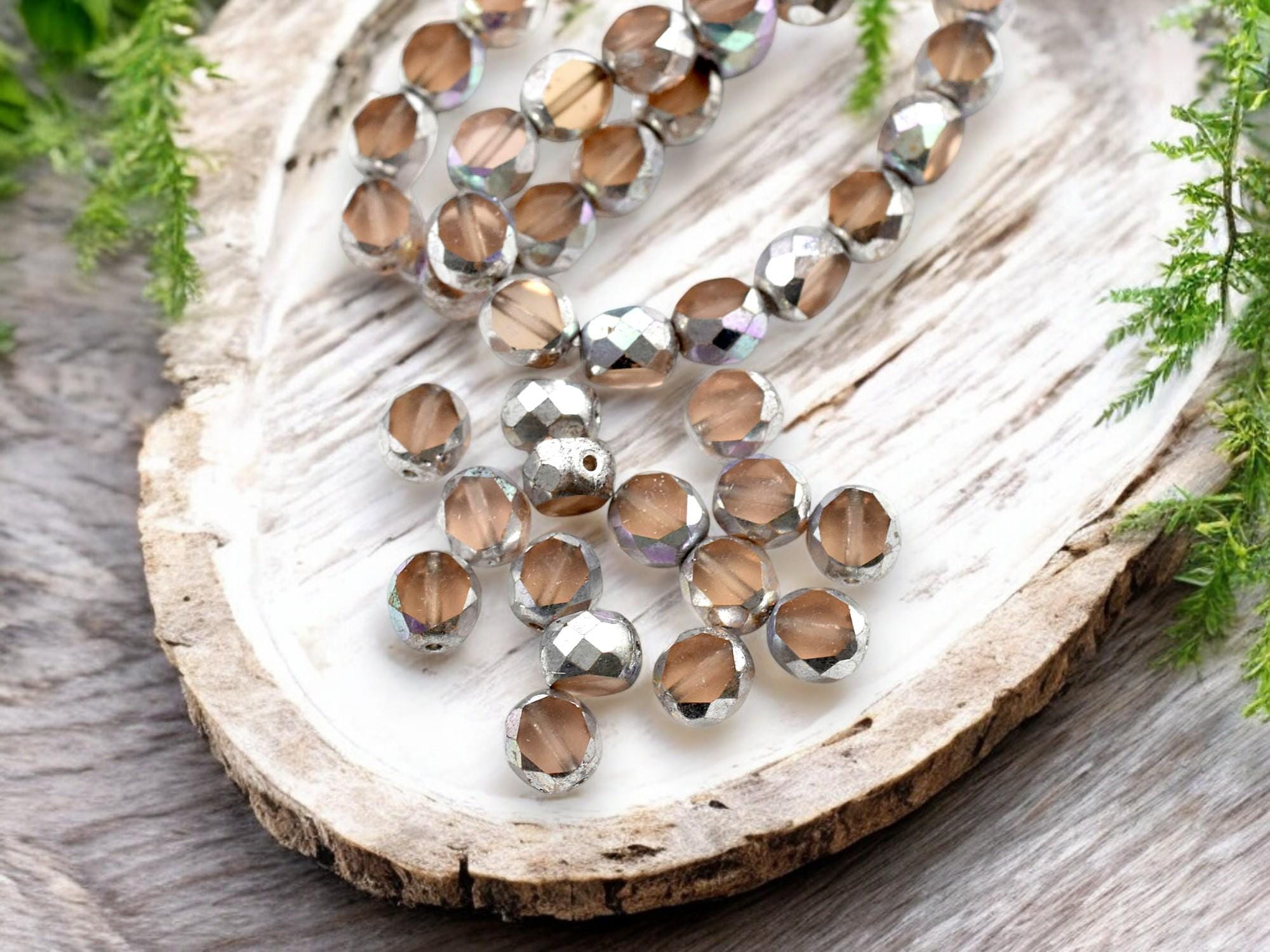 *15* 8mm Silver AB Washed Transparent Peach 2 Cut Fire Polished Round Beads