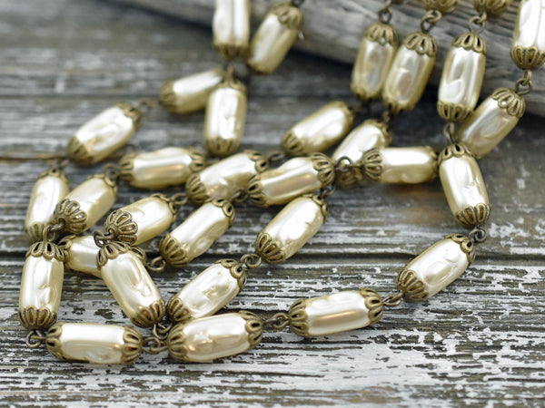 11.5x6.5mm Czech Glass Cream Pearl Chain with Antique Brass Caps