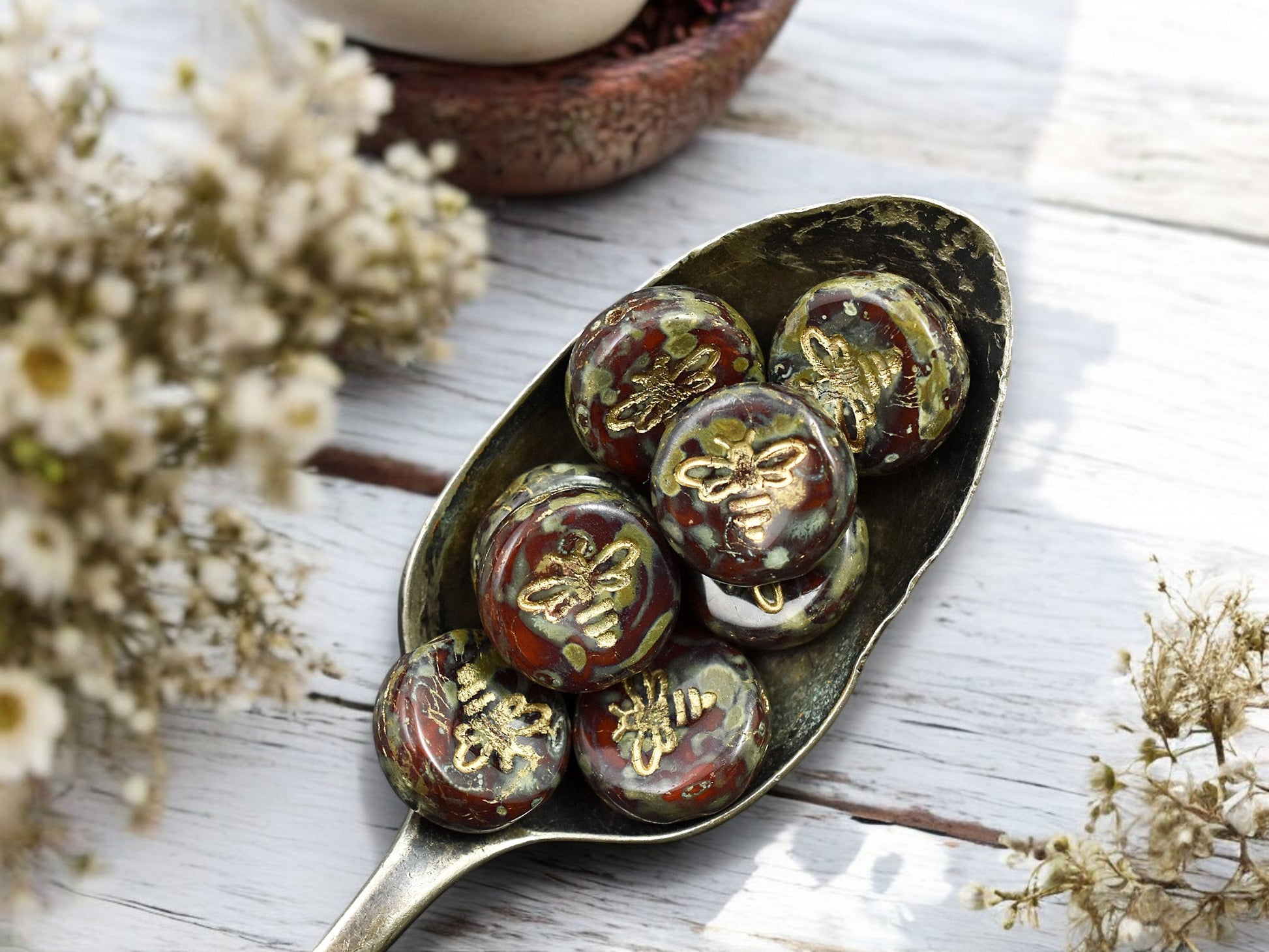 ♥ Type/Shape: Czech pressed glass coin beads with flying bee design (design on both sides of bead)