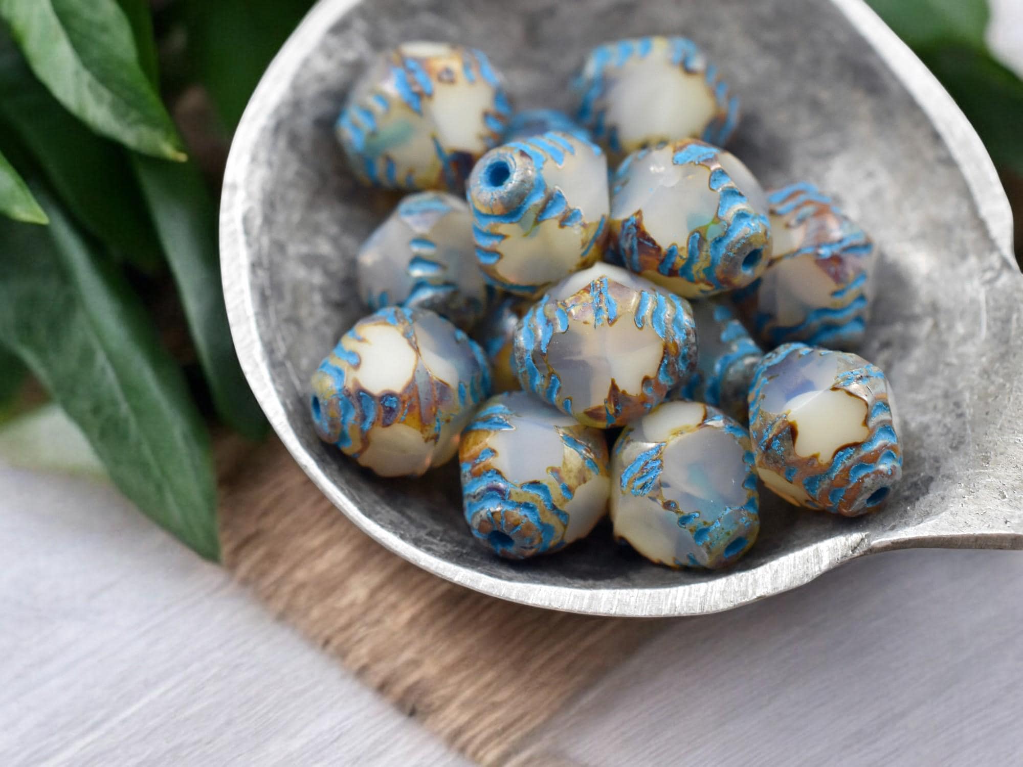 *15* 10x8mm Turquoise Washed White Opal Picasso Faceted Bicone Beads