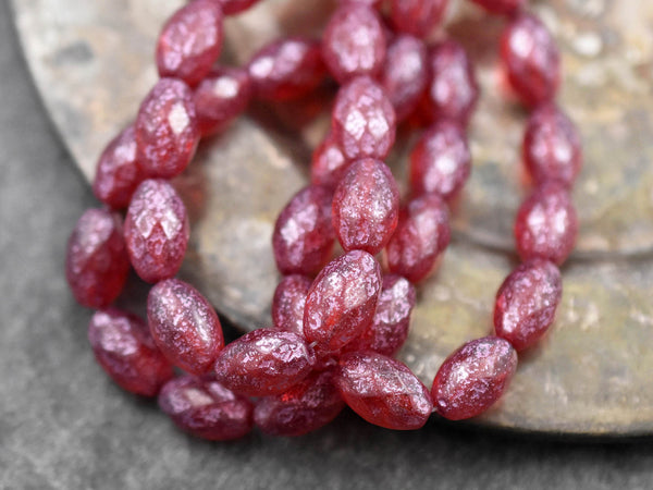 *12* 12x8mm Etched Pink Washed Ruby Red Fire Polished Faceted Oval Beads