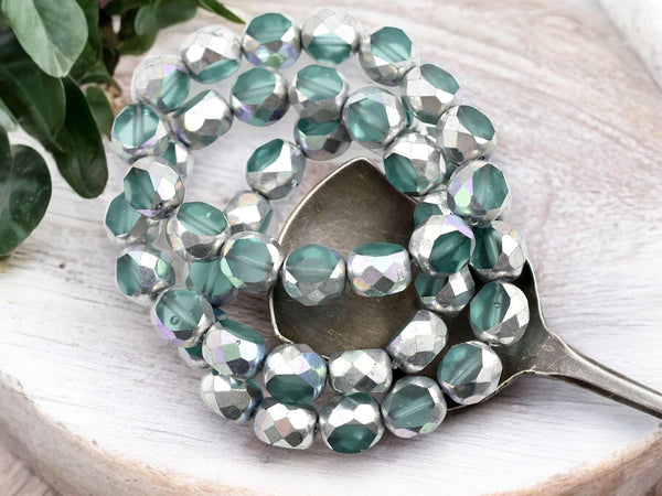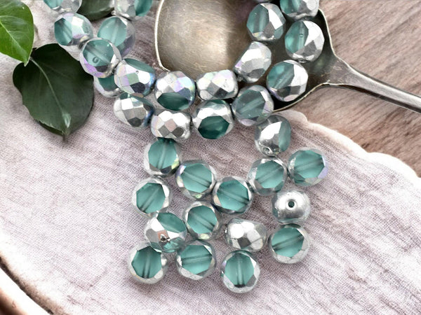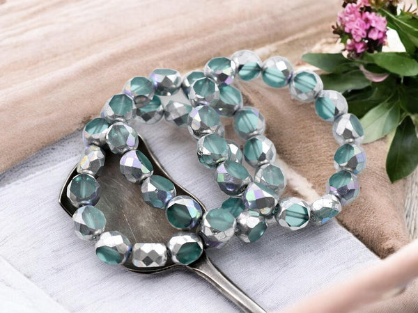 *15* 8mm Silver Washed Aqua 2 Cut Fire Polished Round Beads