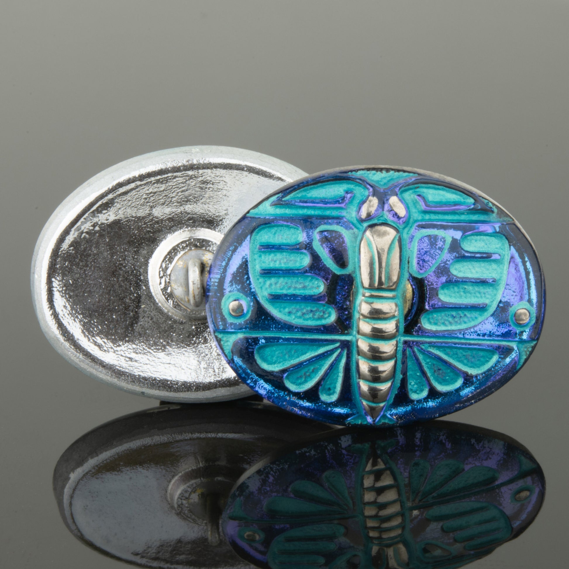29x22mm Oval Art Deco Butterfly Button - Electric Blue Purple Finish with Aqua Wash and Platinum Paint -- Czech Glass Buttons