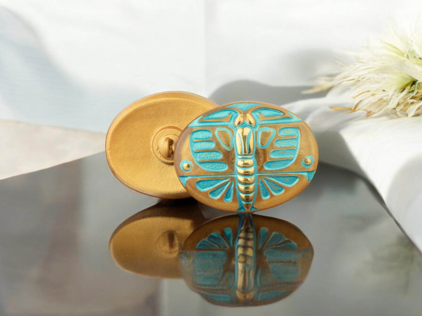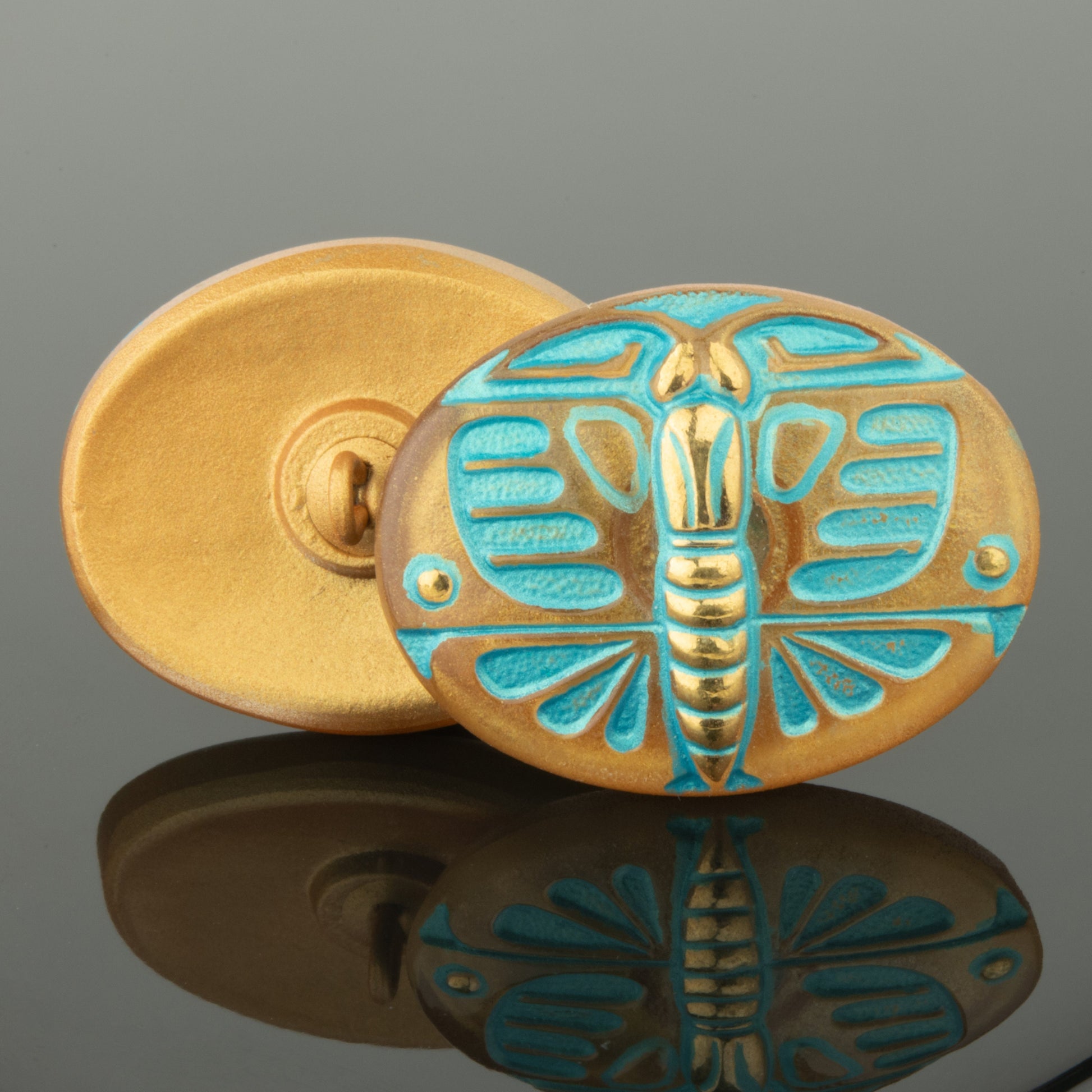 29x22mm Oval Art Deco Butterfly Button - Gold Finish with Turquoise Wash and Gold Paint -- Czech Glass Buttons