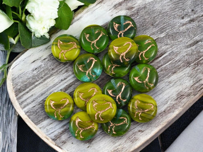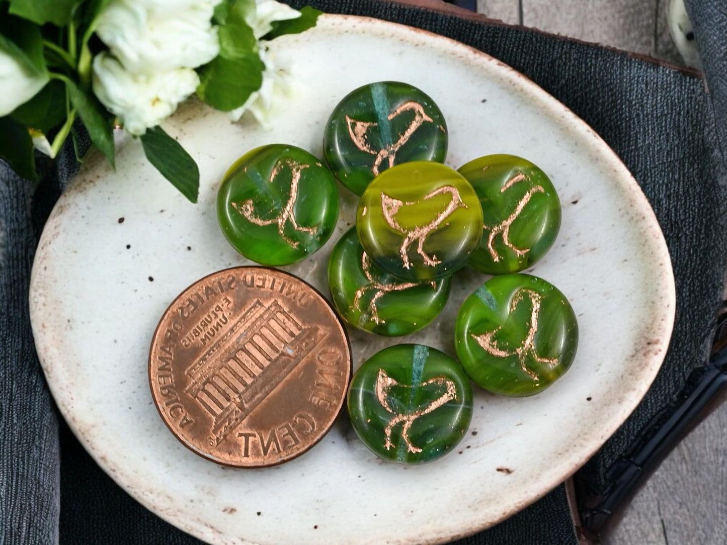 *15* 12mm Copper Washed Blended Green Bird Coin Beads