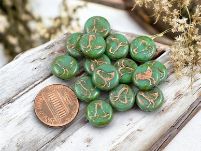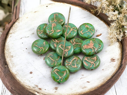 *15* 12mm Copper Washed Opaque Green Turquoise Picasso Bird Coin Beads