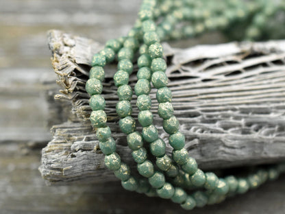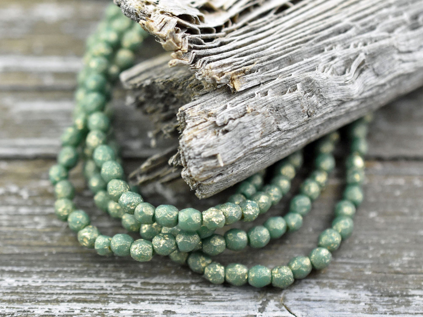 *50* 3mm Gold Washed Etched Sea Green Fire Polished Round Beads
