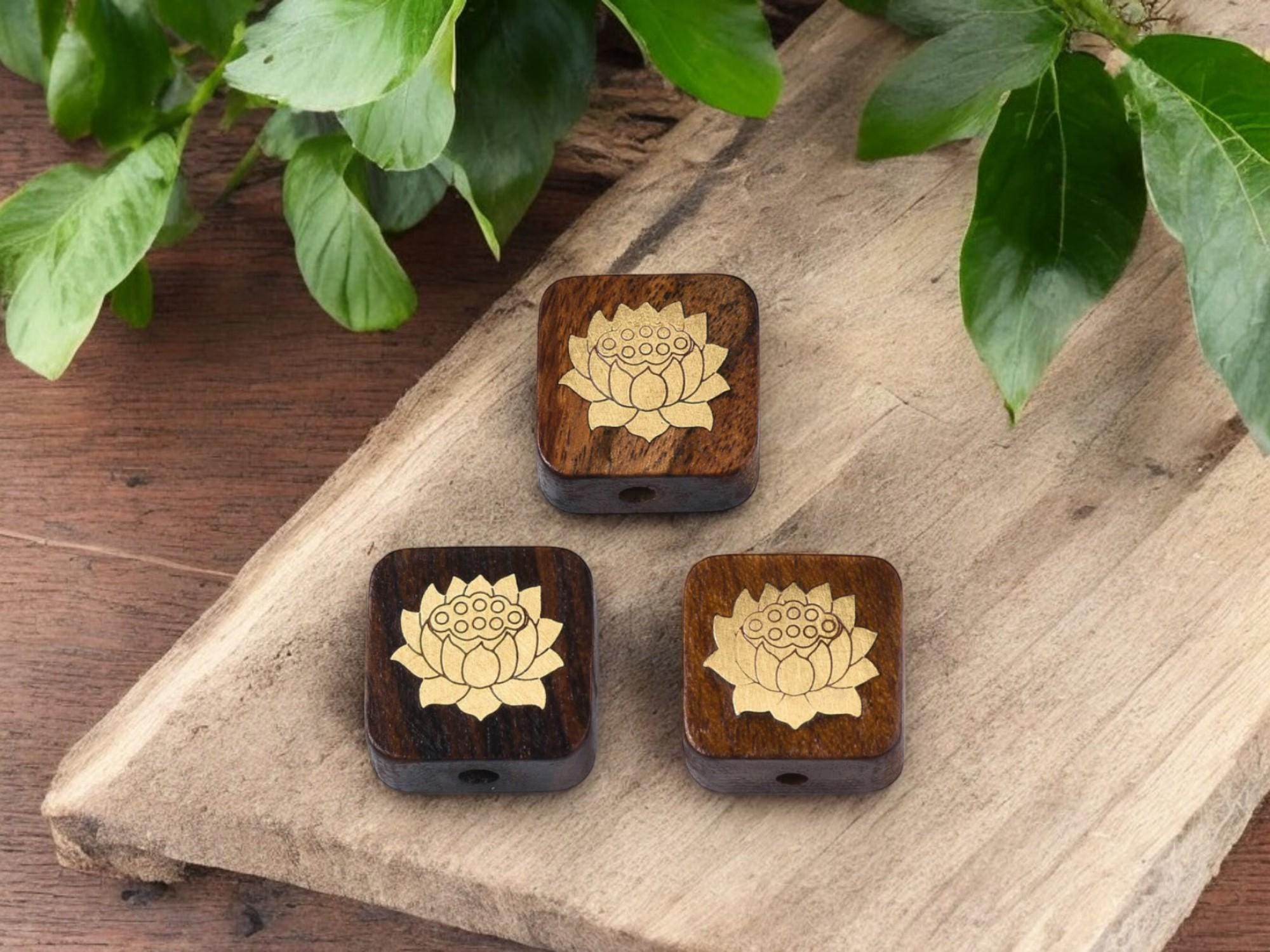 *5* 15x6mm Rosewood covered Brass Lotus Flower Square Beads