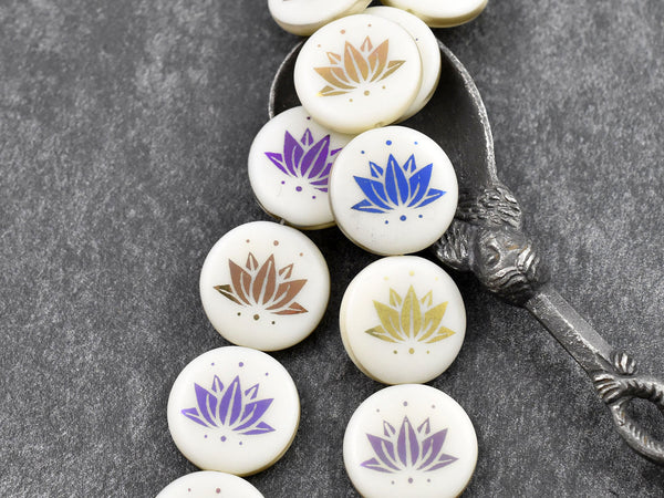 *8* 17mm Opaque Ivory Sliperit Laser Etched Lotus Coin Beads