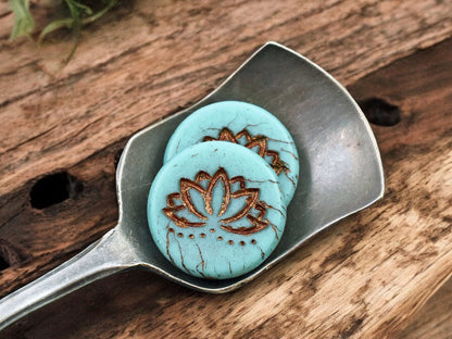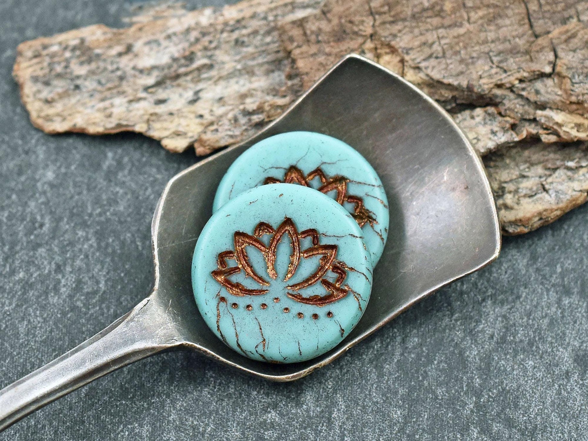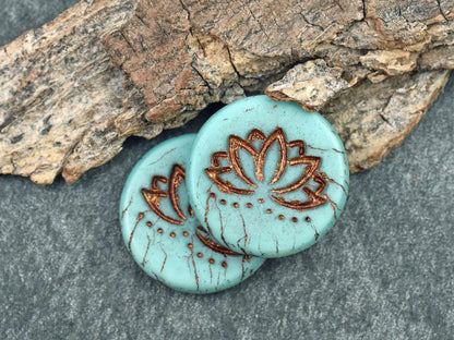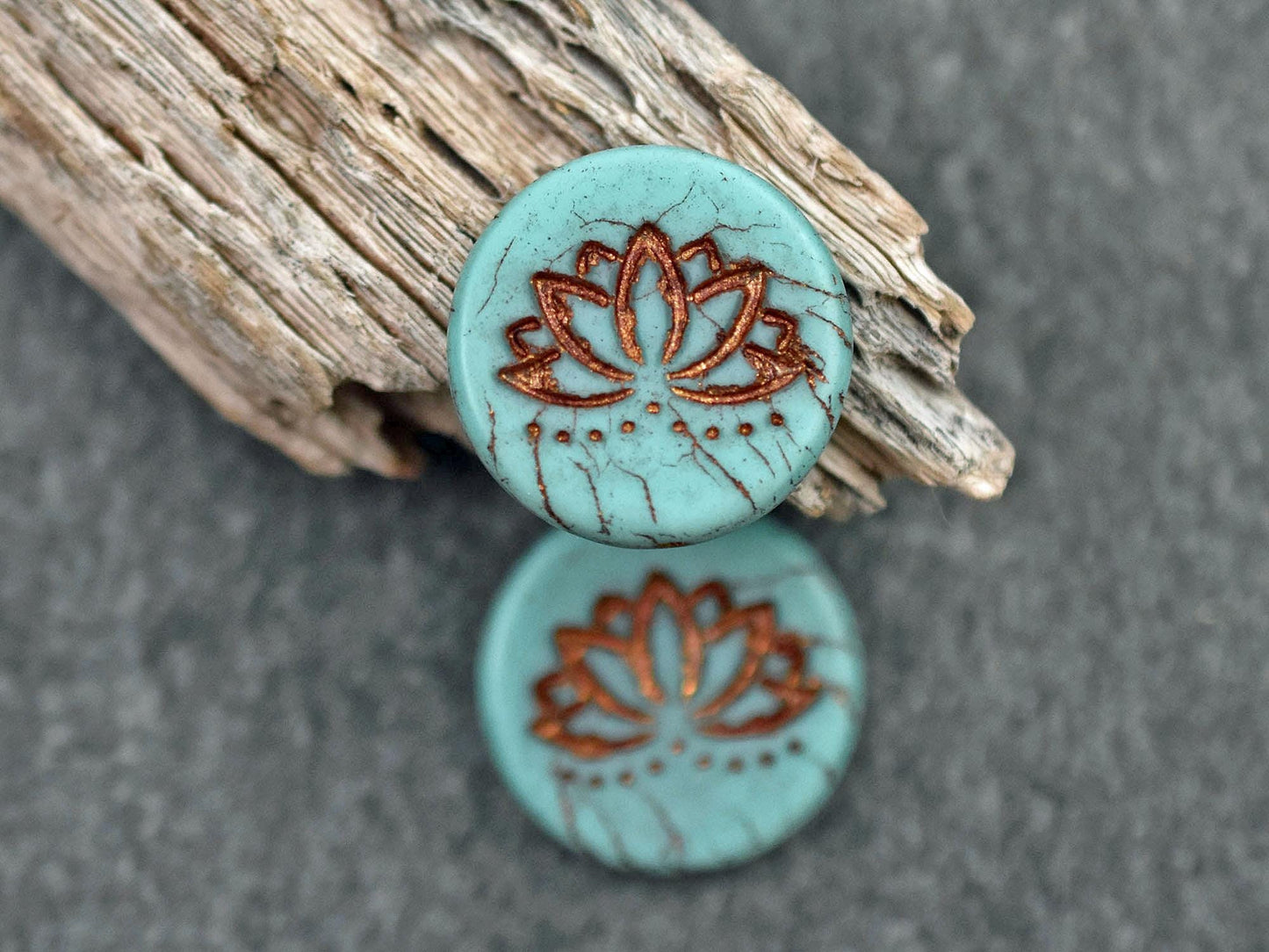 *4* 18mm Bronze Washed Matte Turquoise Lotus Flower Coin Beads