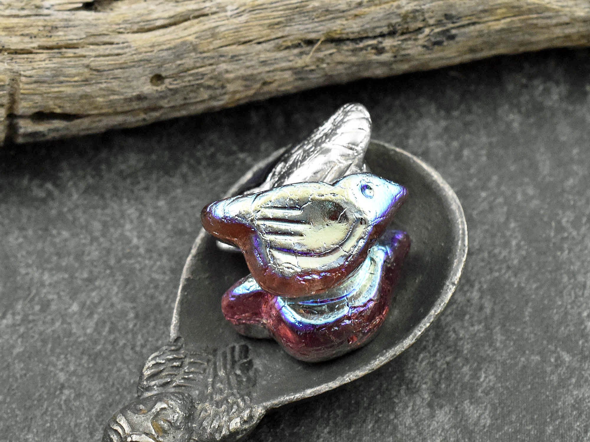 *6* 11x22mm Silver Washed Transparent Purple AB Bird Beads