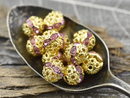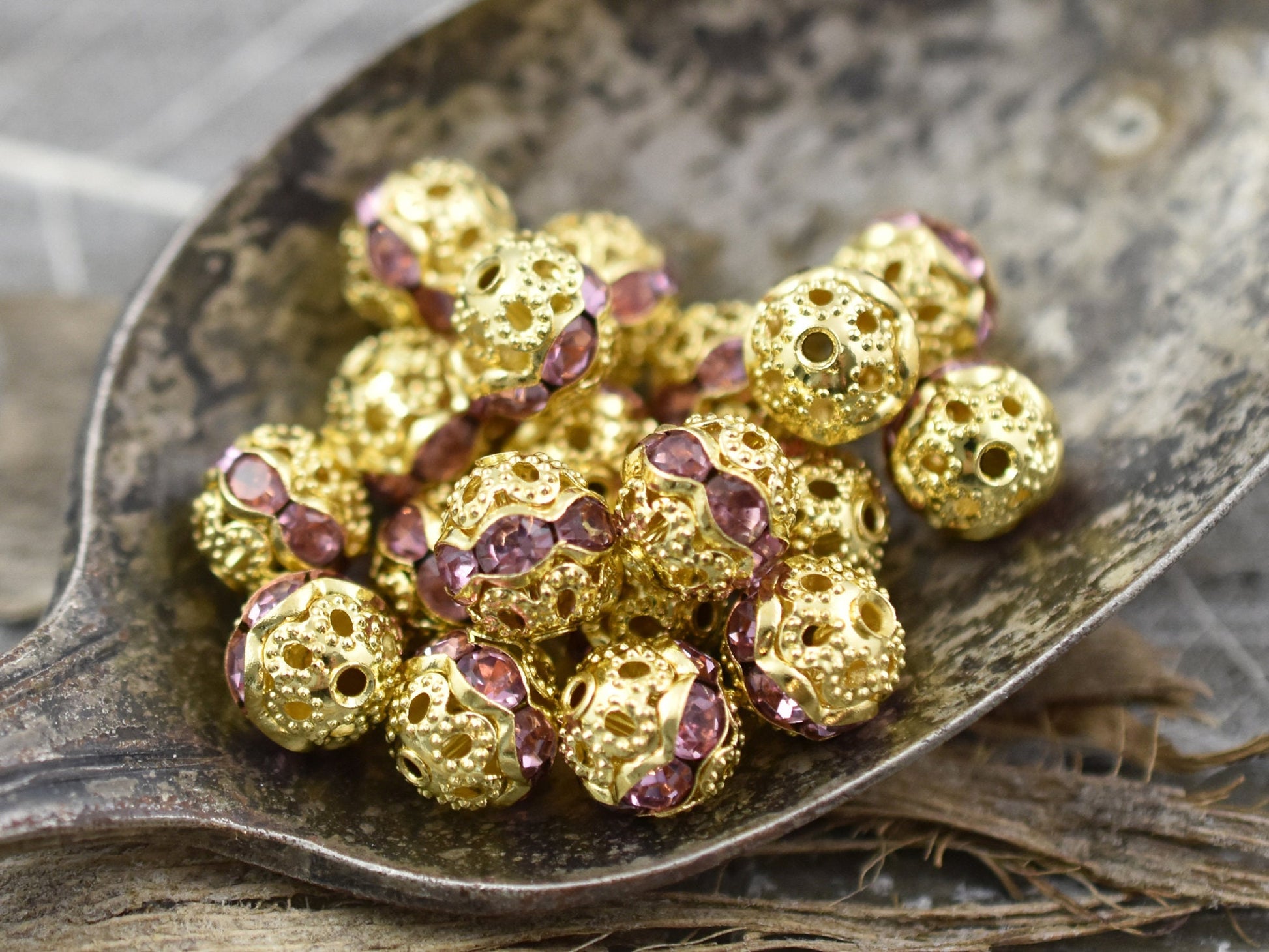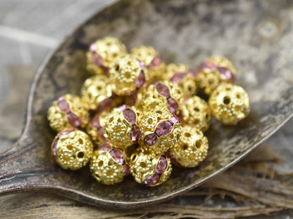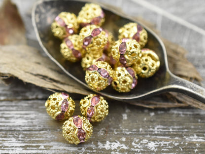 Bright Gold w/ Light Pink Rhinestone Filigree Round Beads - Choose Your Size