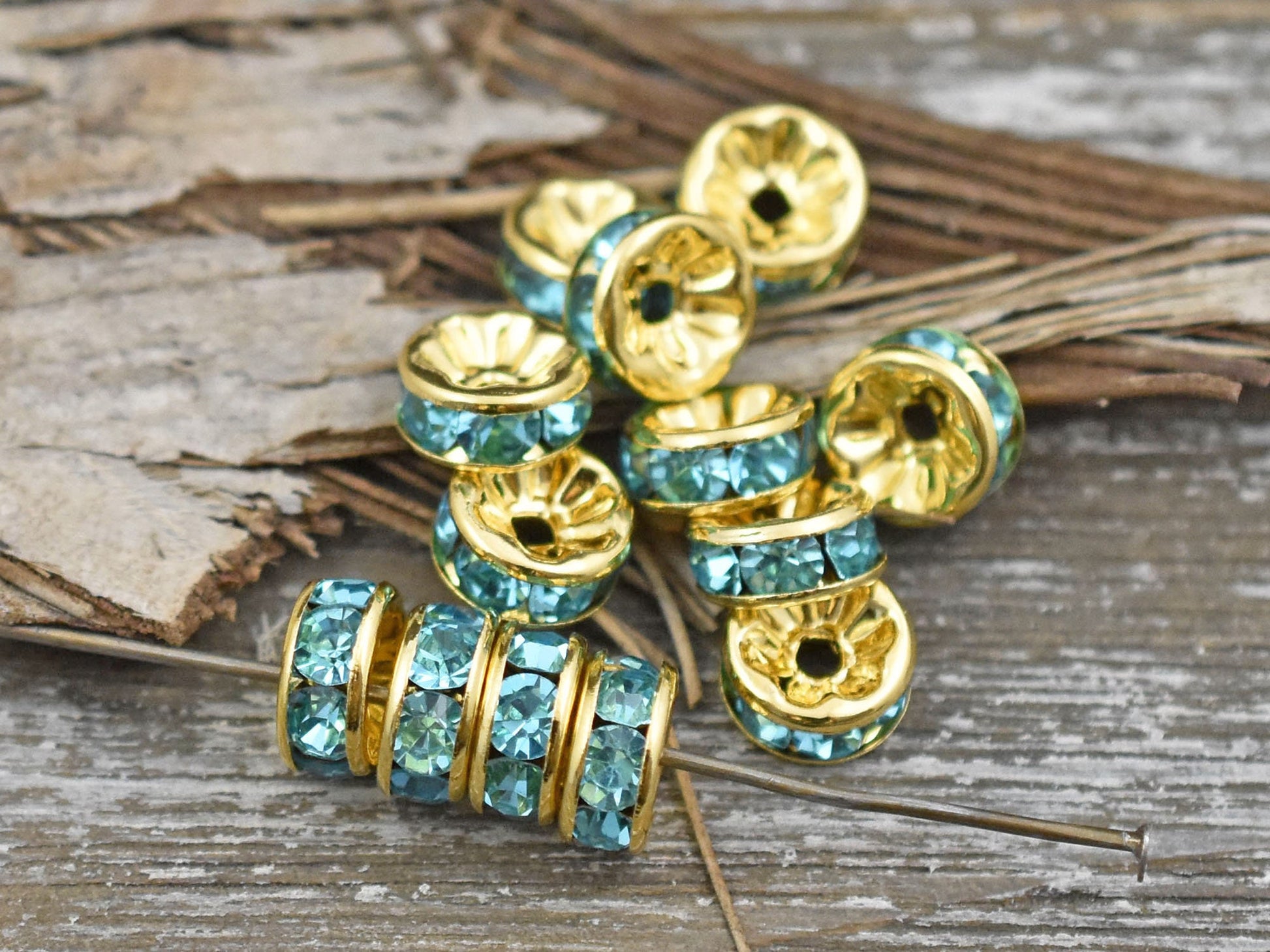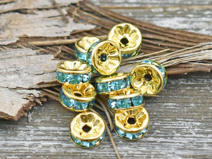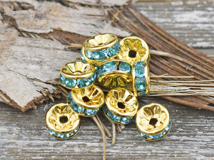 Gold w/Aqua Straight Edge Rhinestone Rondelle Spacer Beads