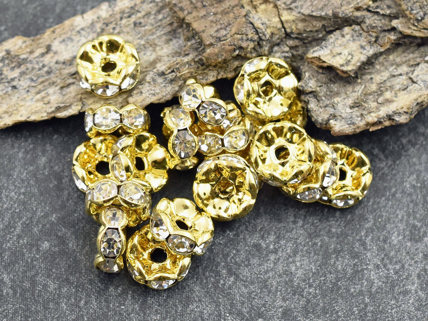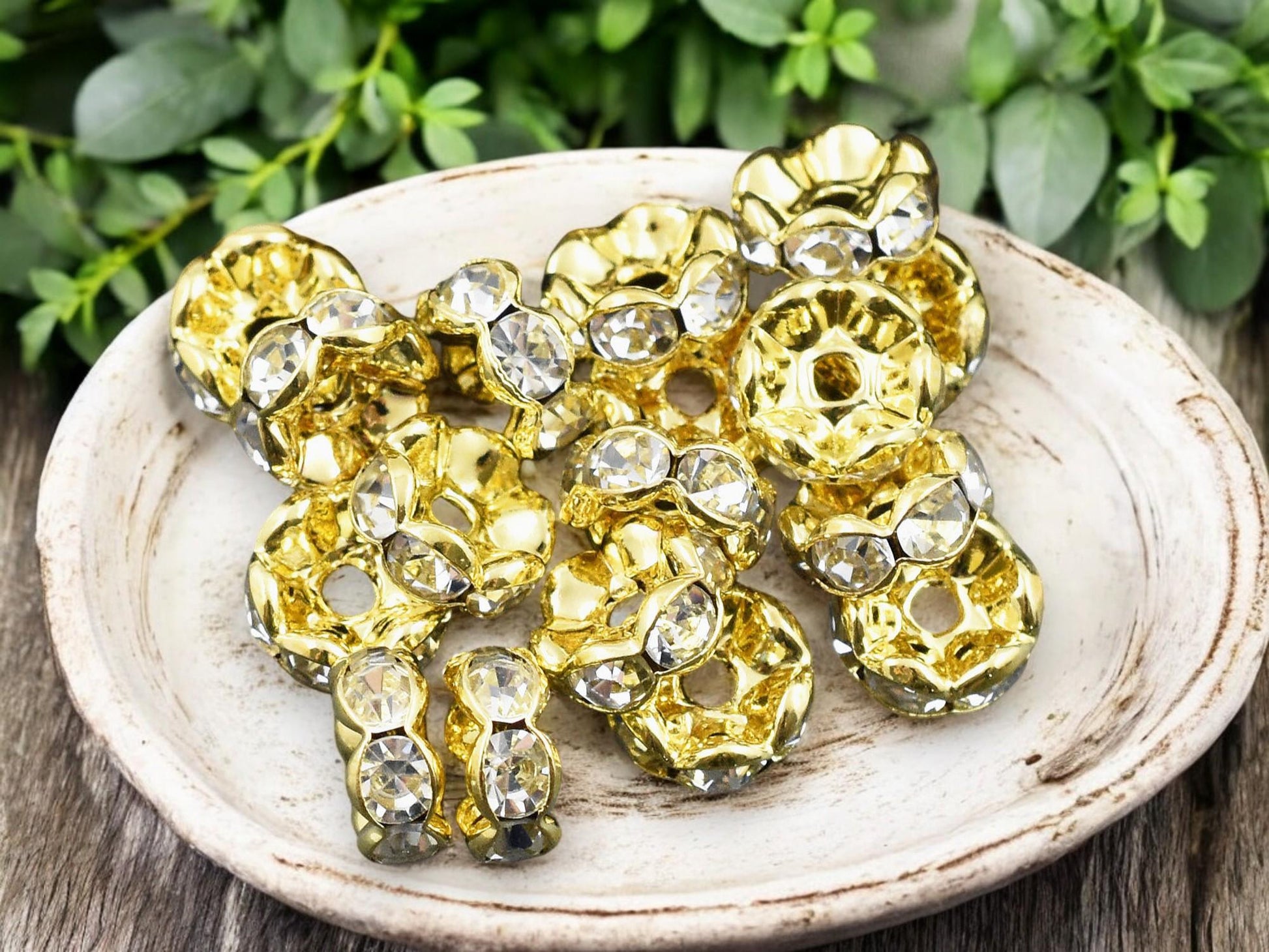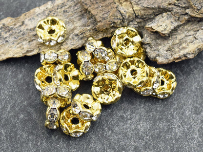 Gold w/ Crystal Rhinestone Wavy Edge Rondelle Spacer Beads