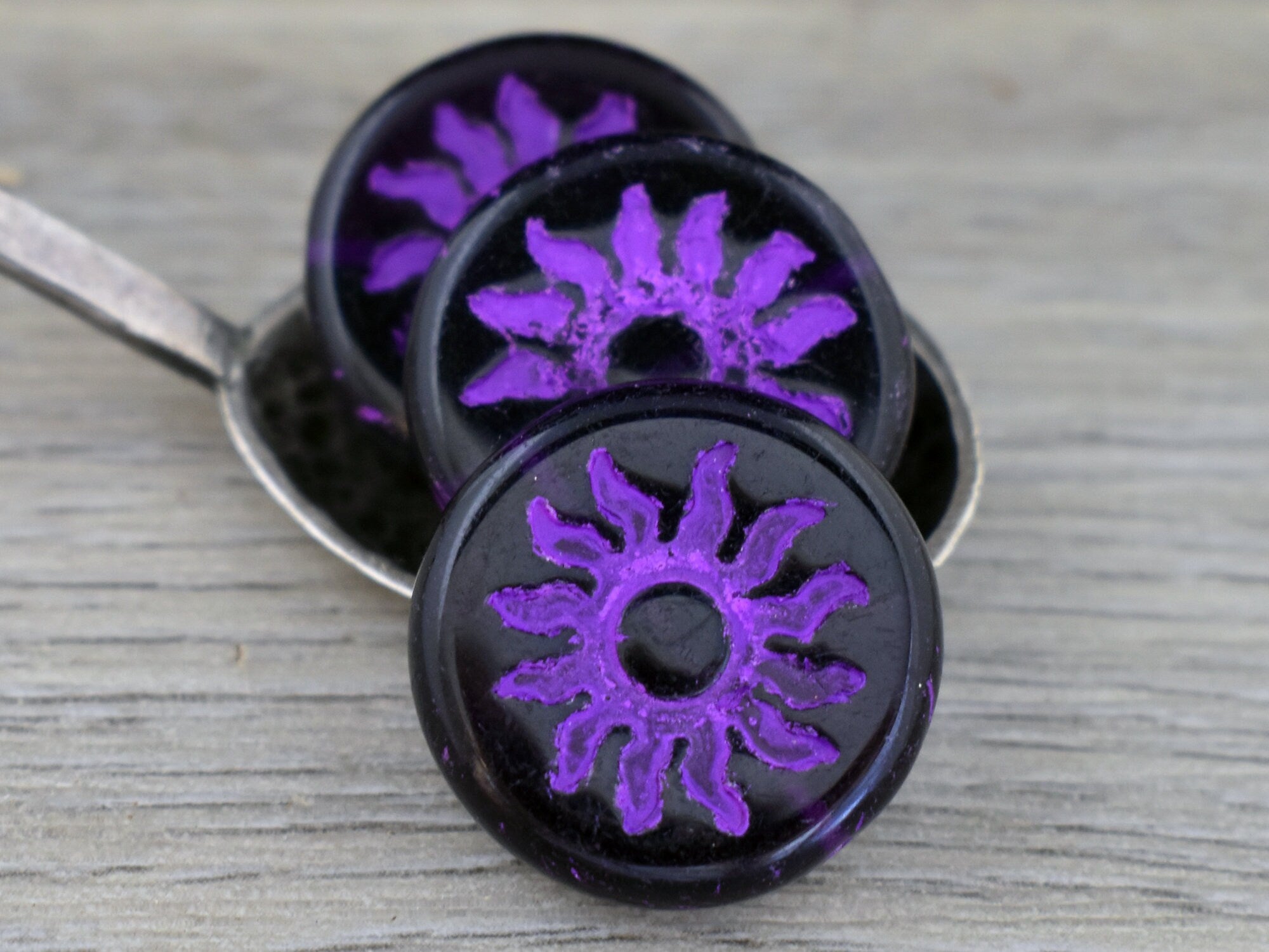 21mm Purple Washed Purple Pansy Sun Design Coin Beads - 2 Beads