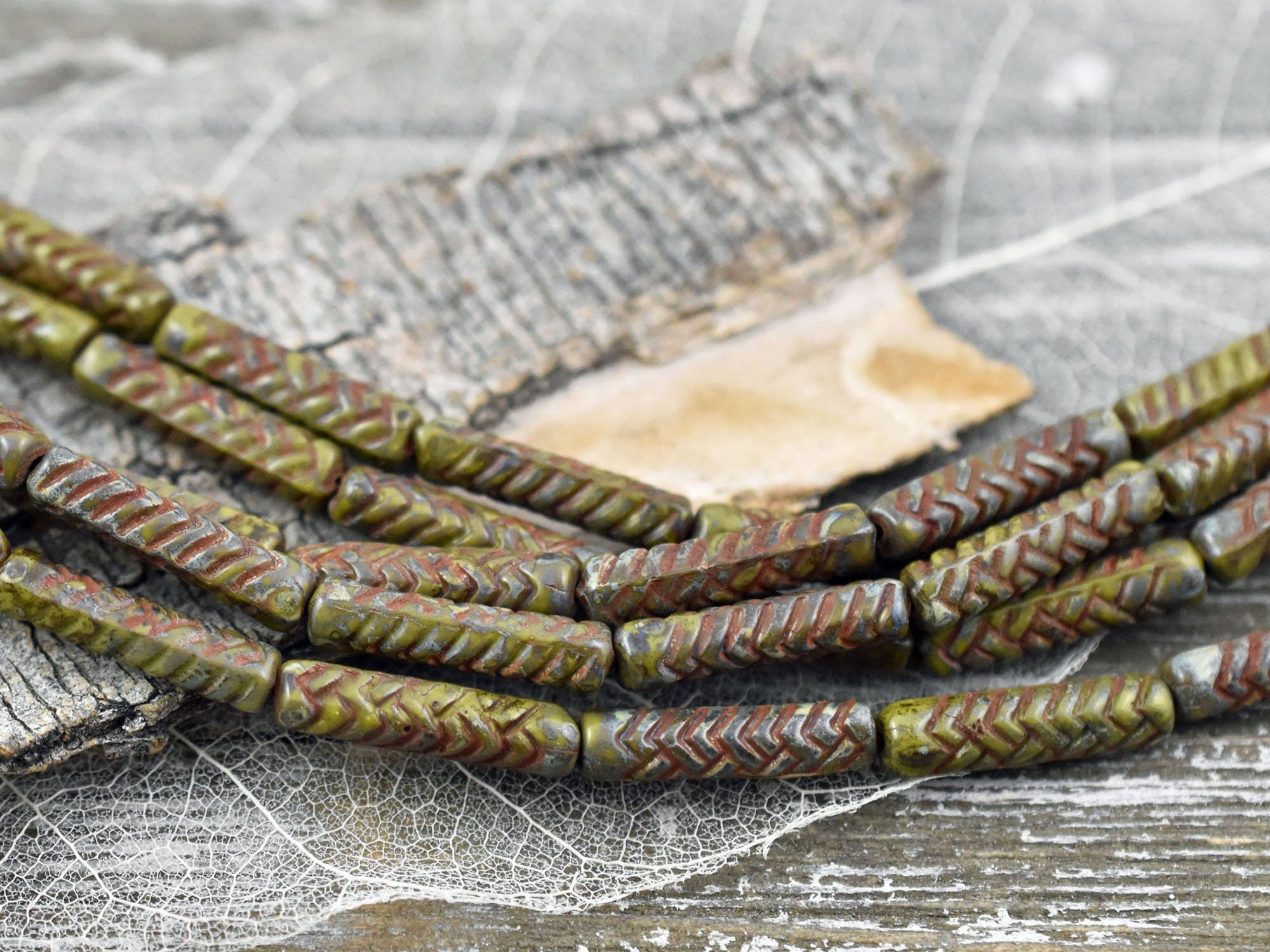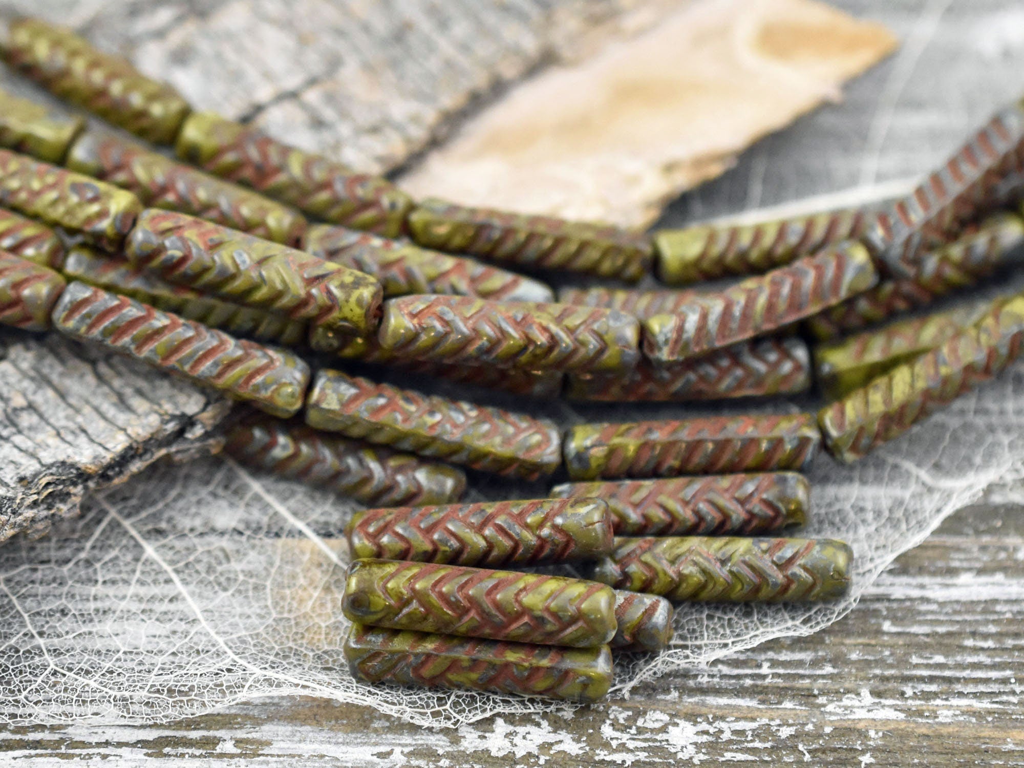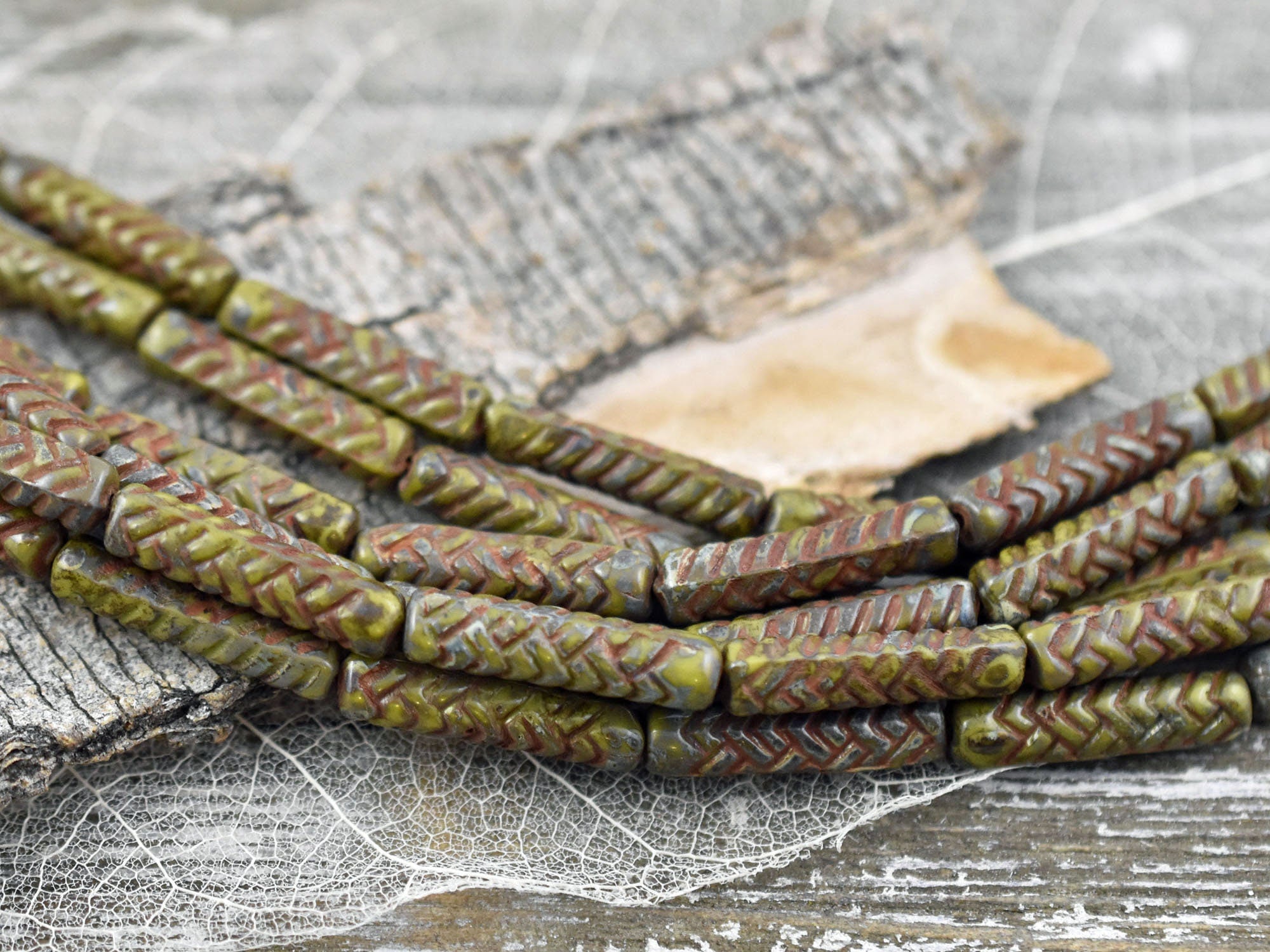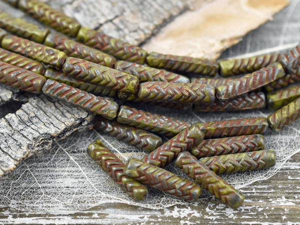 *11* 18x4mm Antiqued Chartreuse Picasso Basket Weave Tube Beads