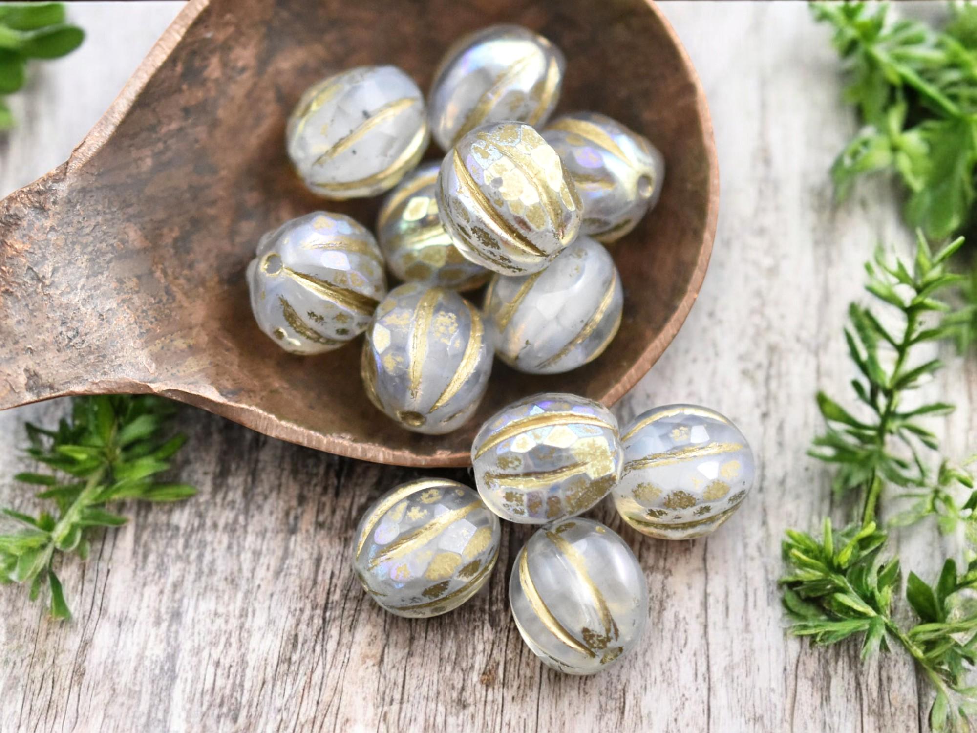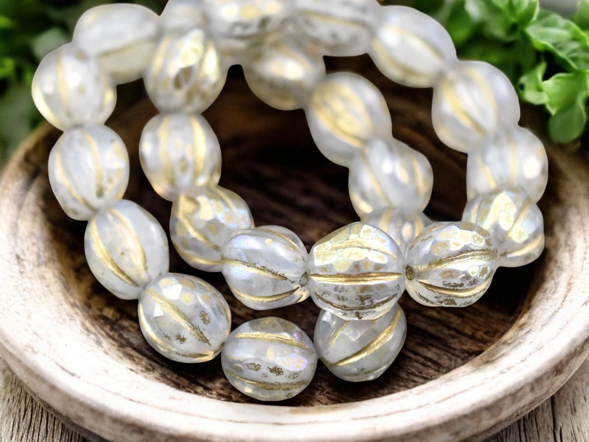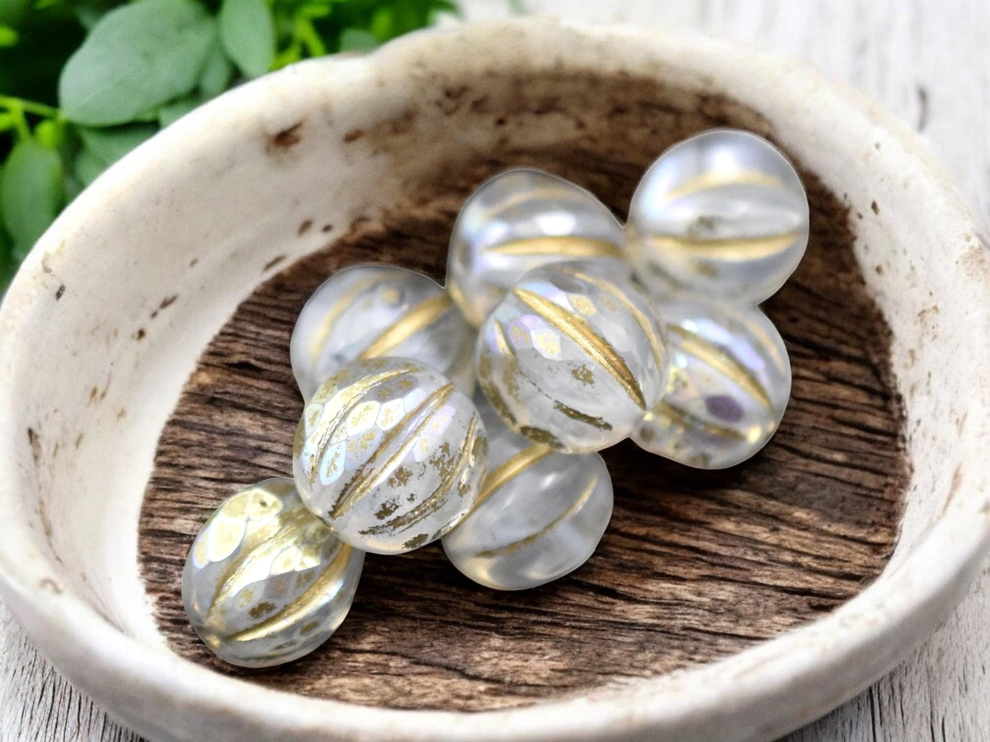*12* 10mm Gold Washed Crystal Opaline AB Faceted Round Melon Beads