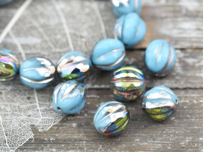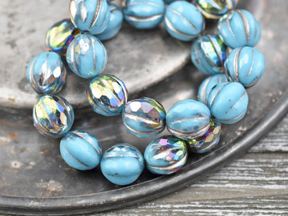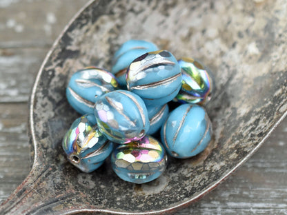 *12* 10mm Metallic Beige Washed Opaque Sky Blue AB Faceted Round Melon Beads