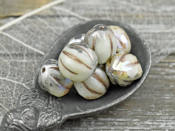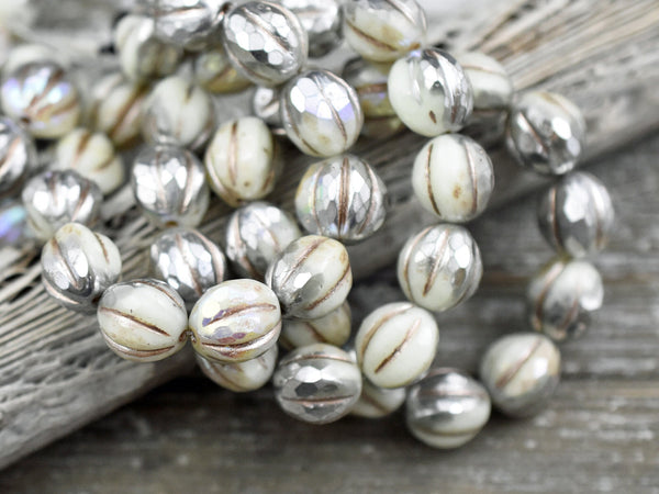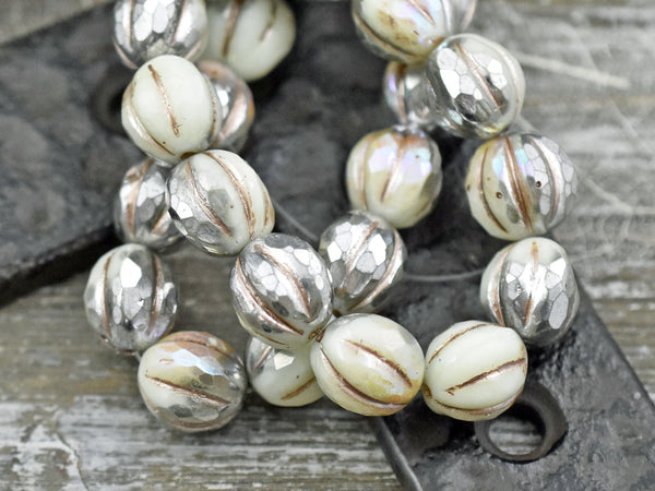 *12* 10mm Metallic Beige Washed Silvered Ivory Faceted Round Melon Beads