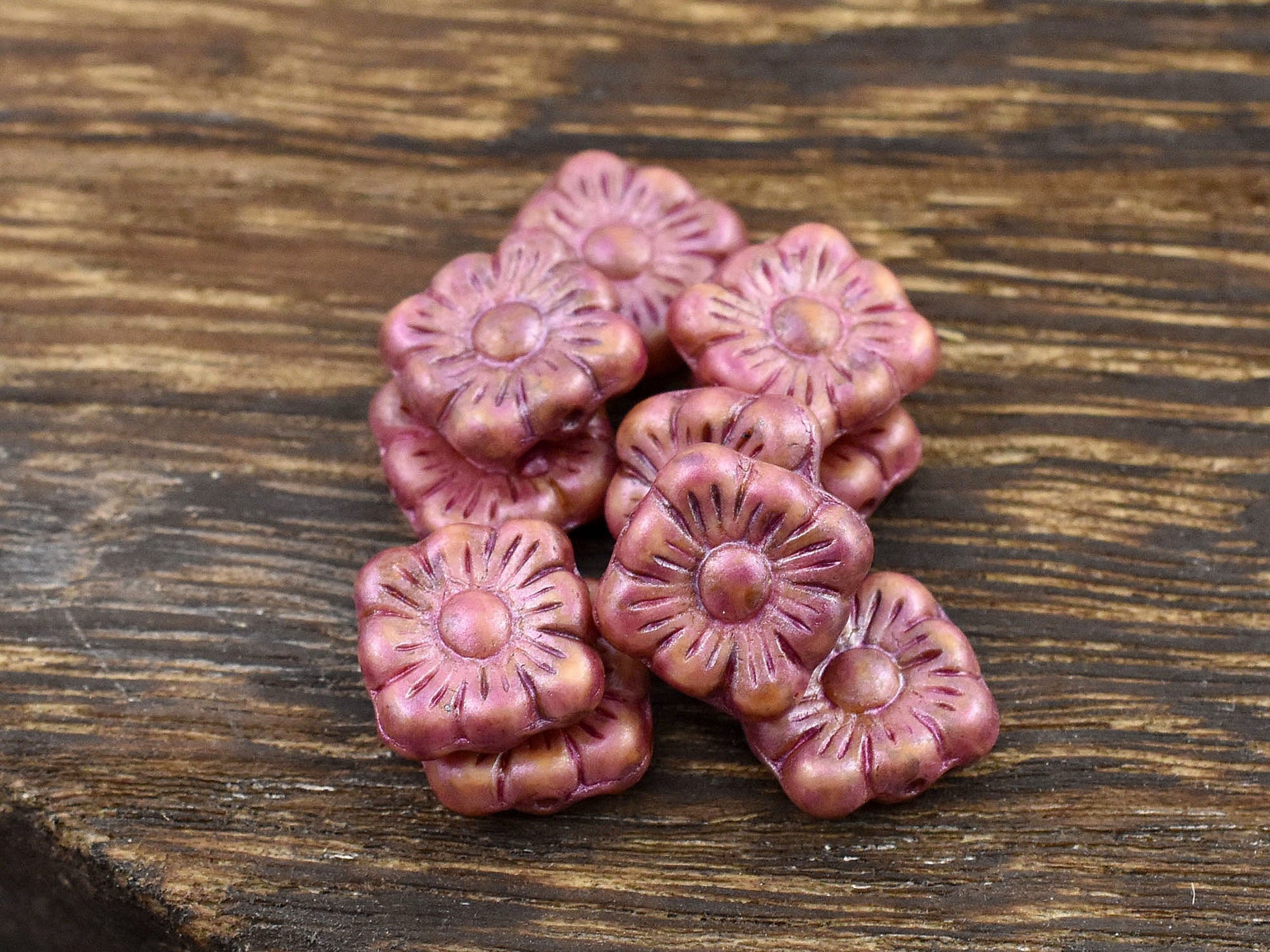 *10* 11mm Matte Pink Luster Washed Opaque Beige Square Flower Beads