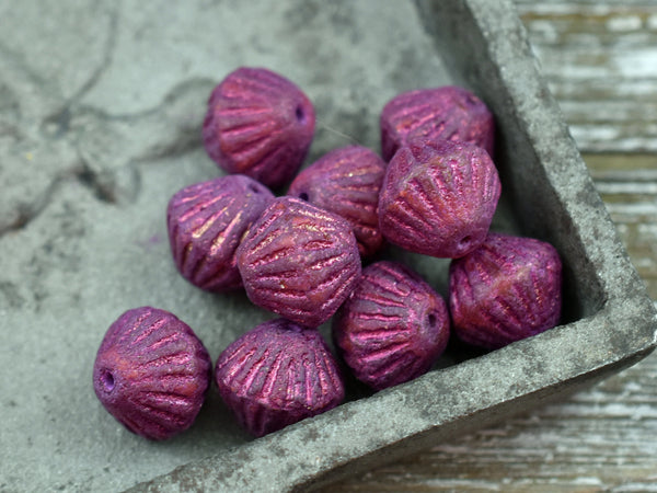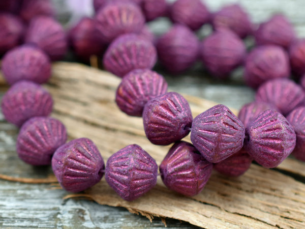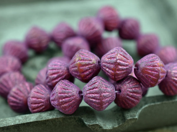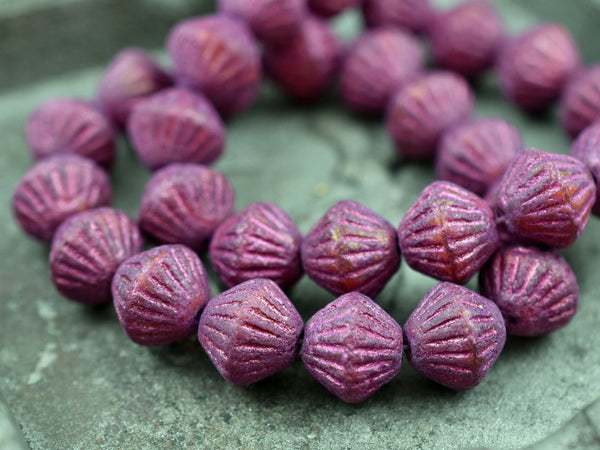 *15* 11mm Pink Washed Etched Magenta Purple Carved Bicone Beads