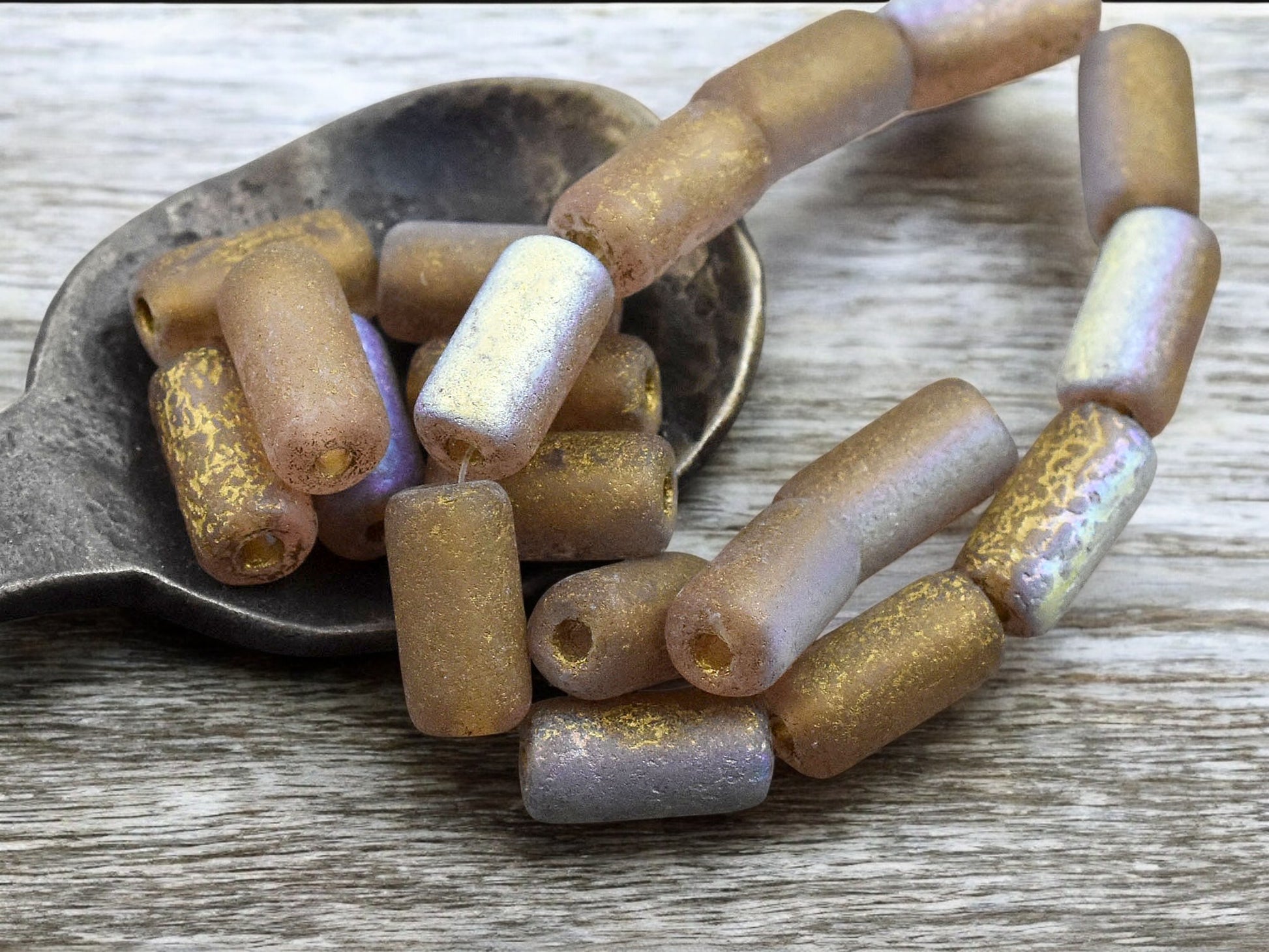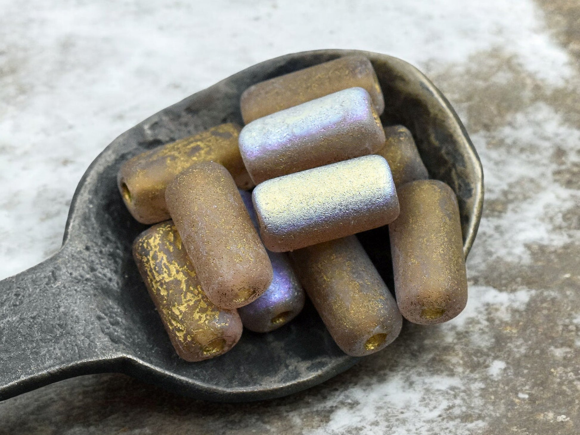 *10* 14x7mm Gold Washed Etched Brown Topaz AB Large Hole Tube Beads
