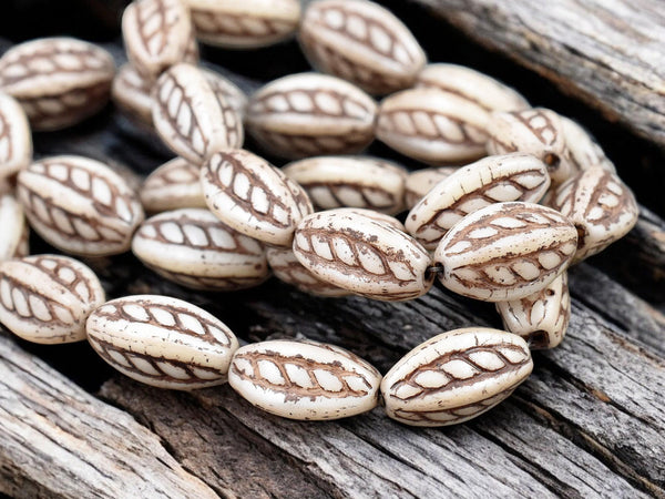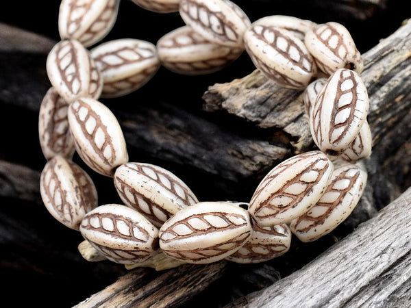 *10* 15x9mm Brown Washed Alabaster White Twisted Oval Beads