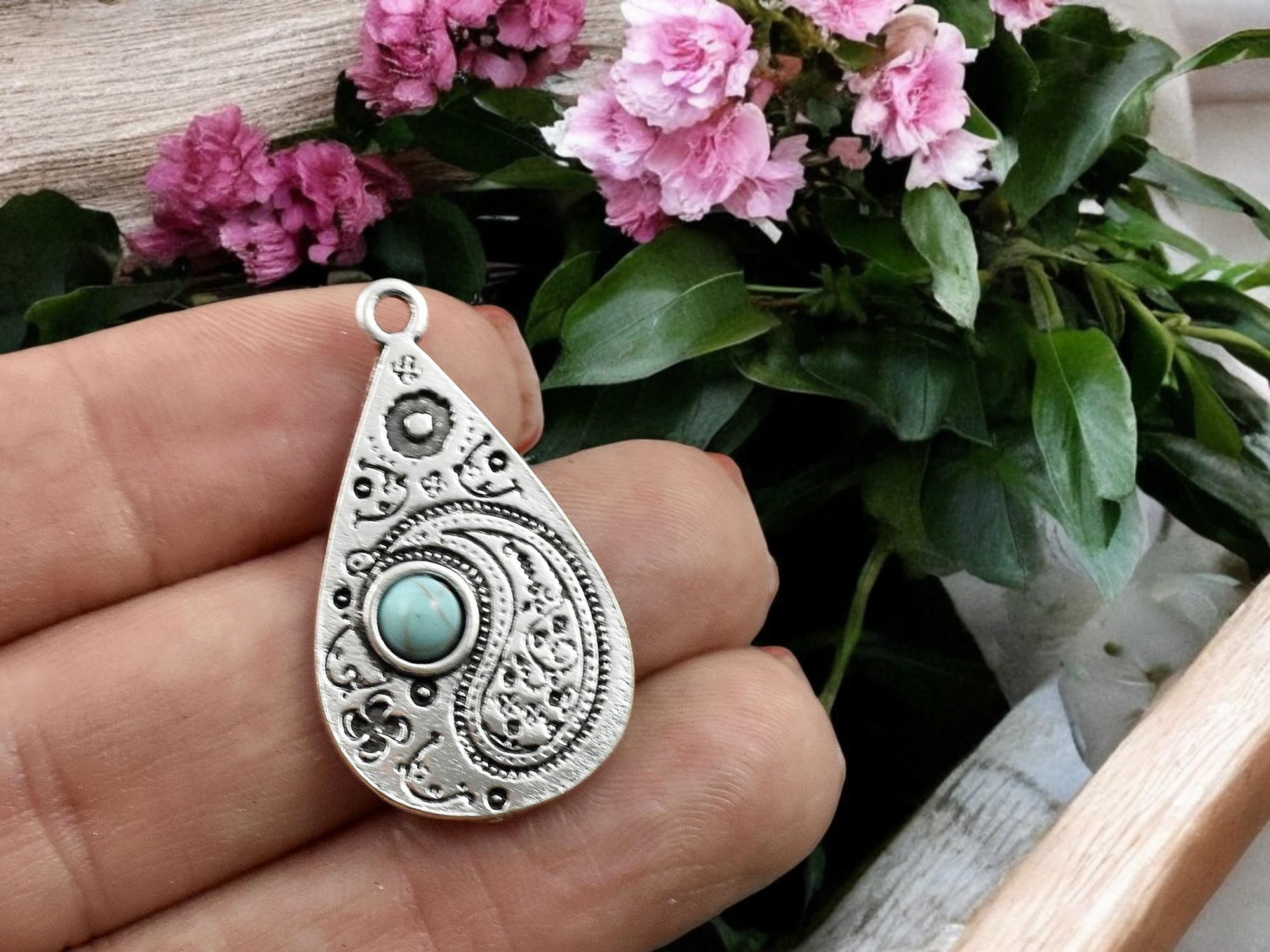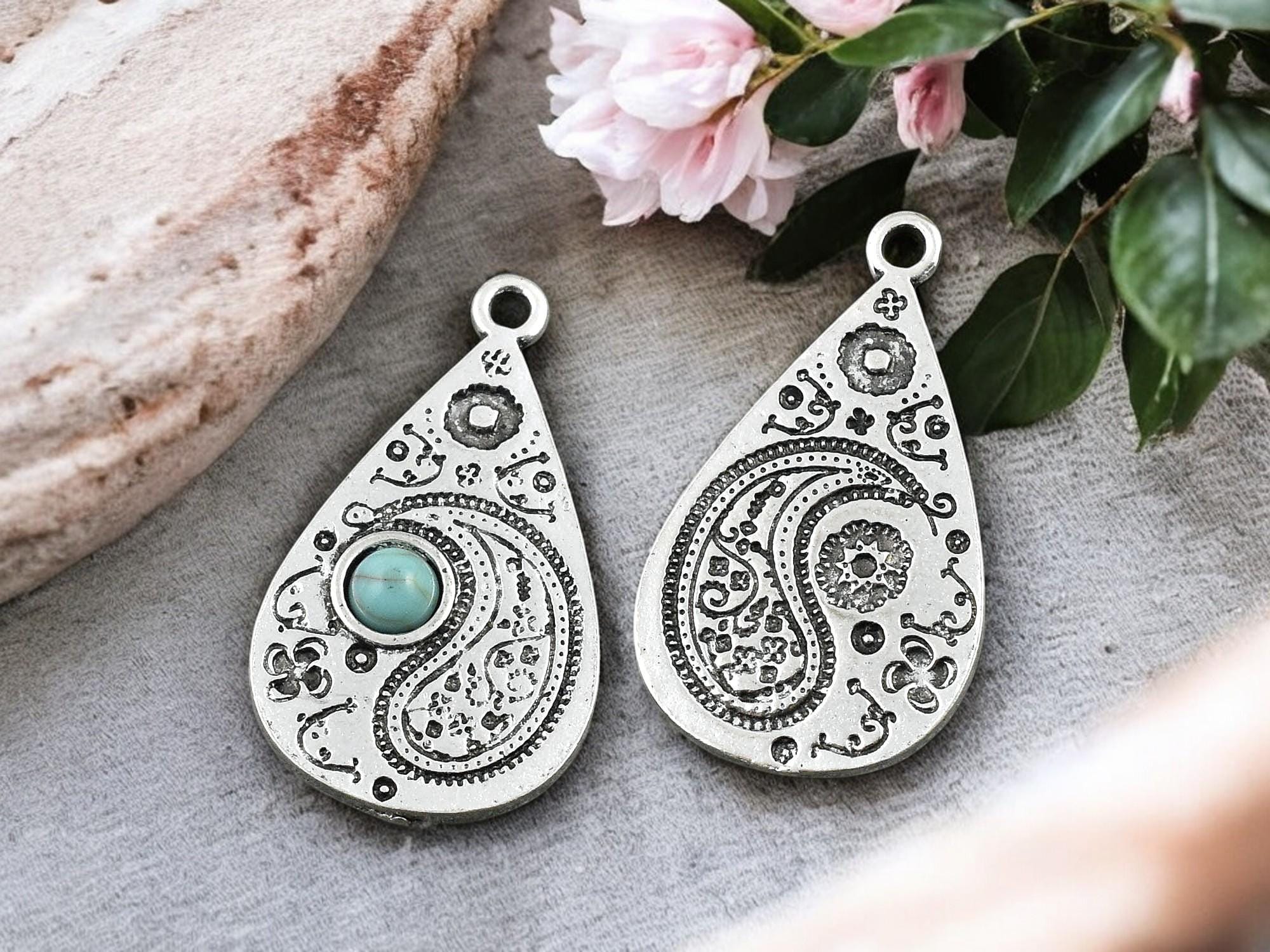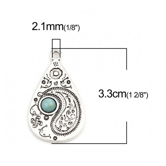 *5* 33x19mm Antique Silver w/Turquoise Paisley Drop Pendants