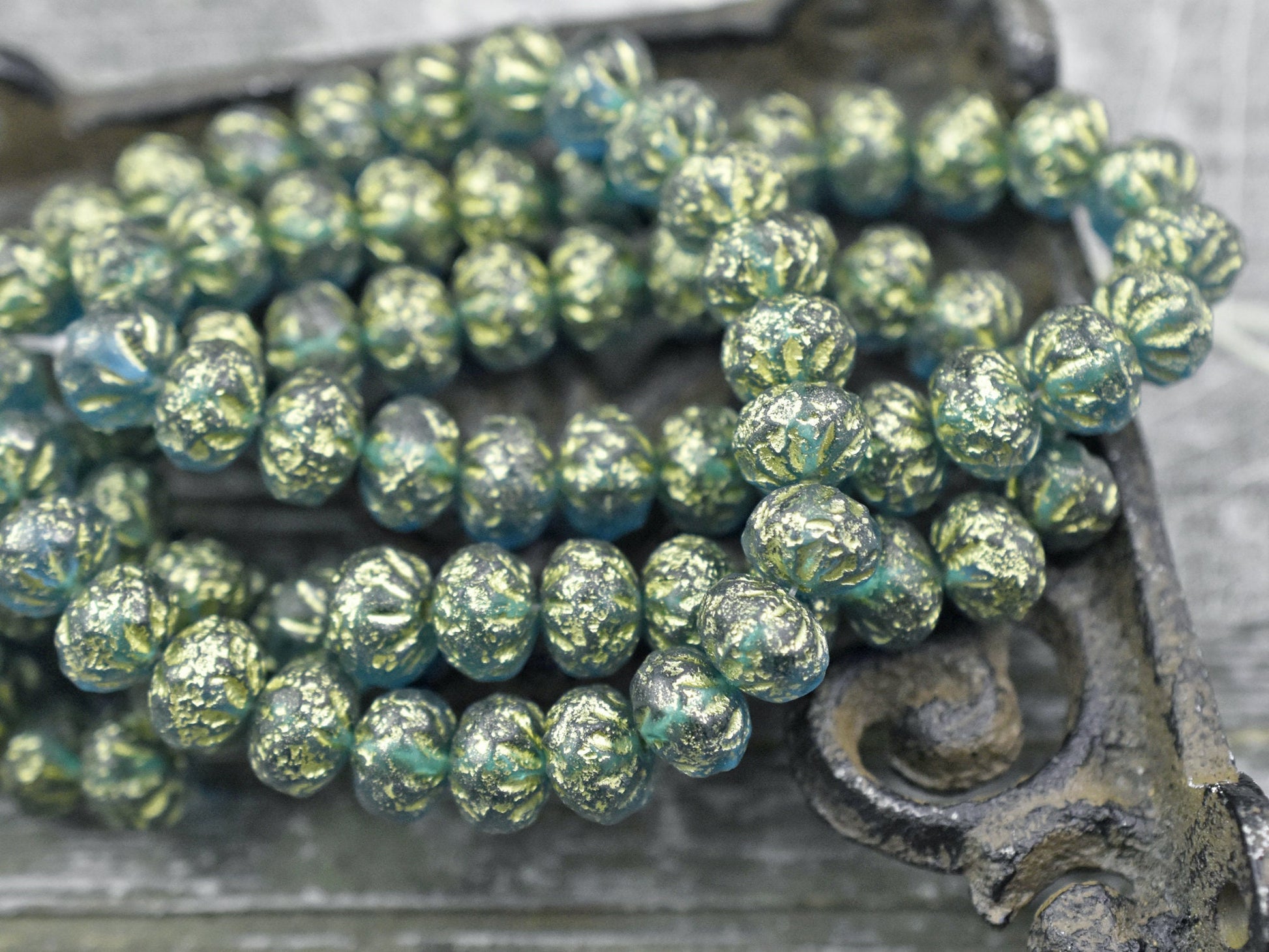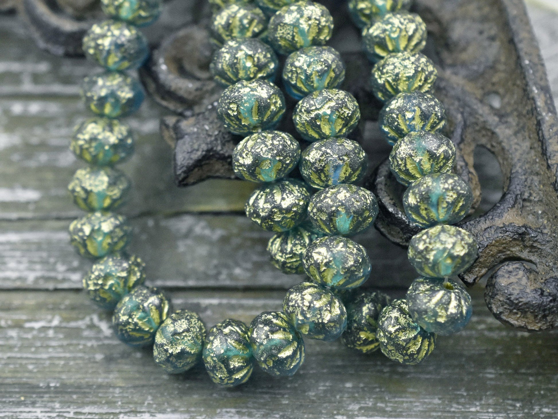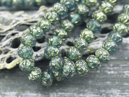 *10* 6x9mm Gold Washed Etched Teal Cruller Rondelle Beads