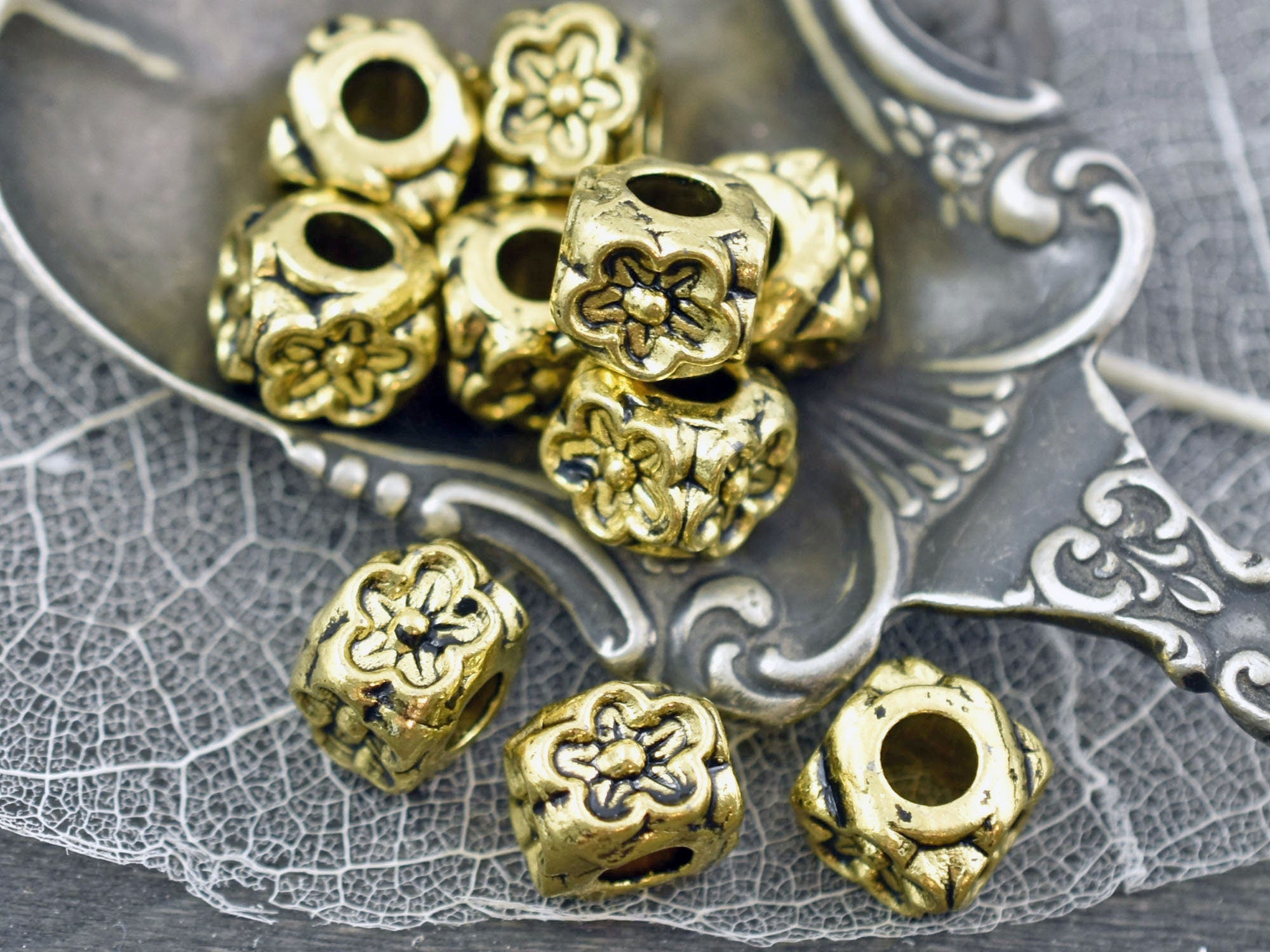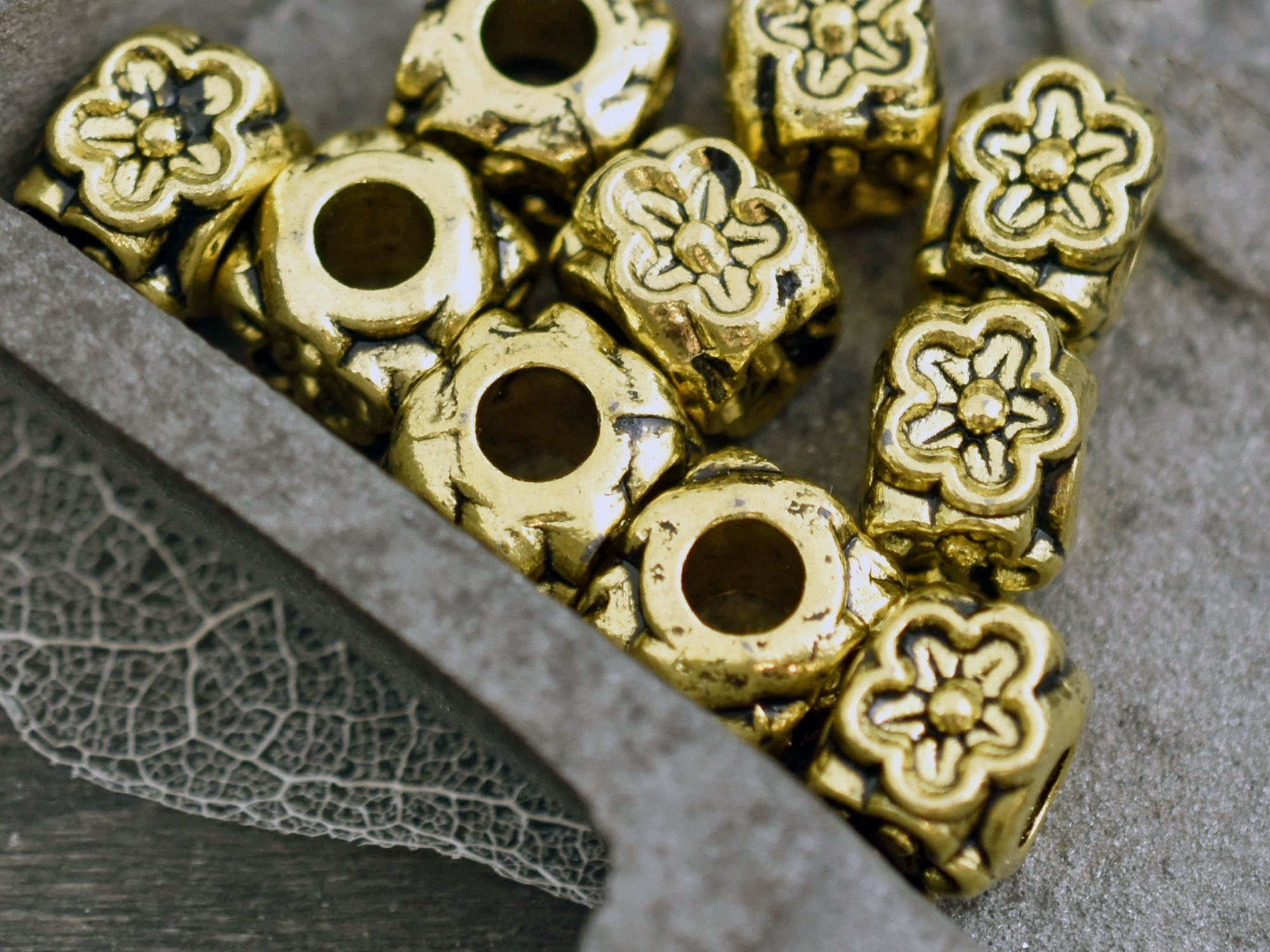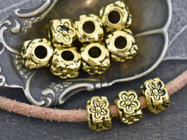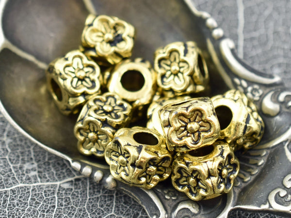 *10* 8x7mm Antique Gold Large Hole Floral Cube Beads