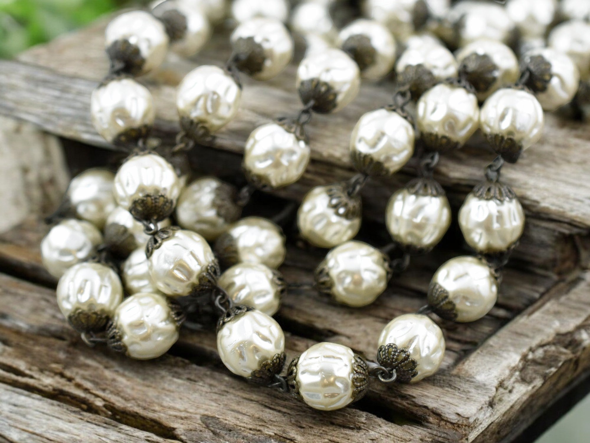 10mm Czech Glass Cream Baroque Pearl Chain with Bronze Caps -- Sold By The Foot