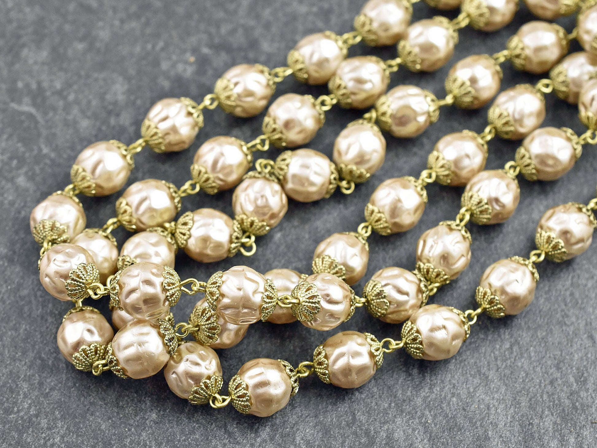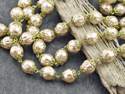 10mm Czech Glass Lt Coffee Baroque Pearl Chain w/Gold Caps -- Sold by the foot