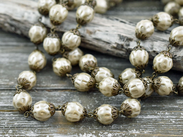 10mm Czech Glass Satin Taupe Baroque Pearl Chain with Antique Bronze Caps -- Sold by the foot