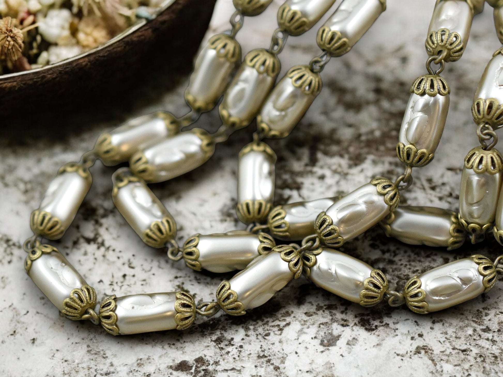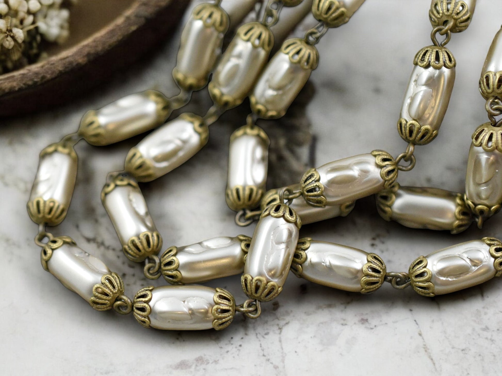 11.5x6.5mm Czech Glass Satin Taupe Pearl Chain with Ant Brass Caps -- Sold by the foot