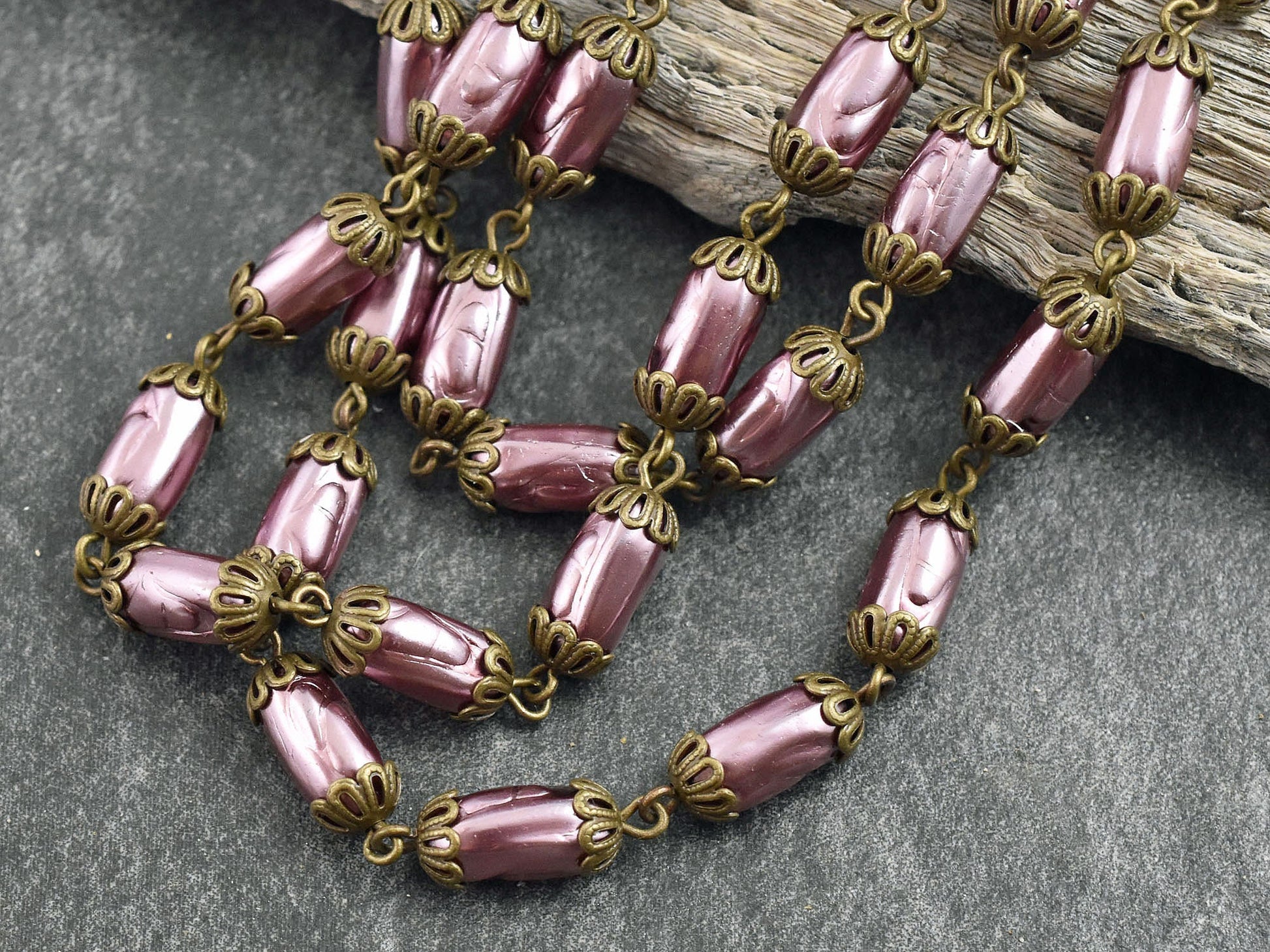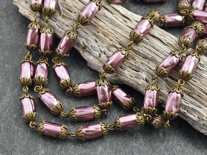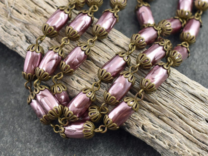 11x6mm Czech Glass Pink Oval Baroque Pearl Chain w/Antique Bronze Caps -- Sold by the foot