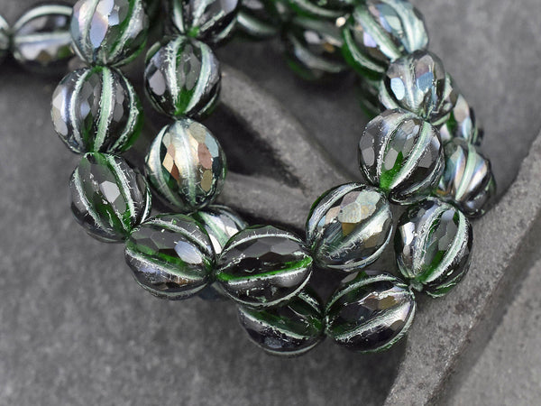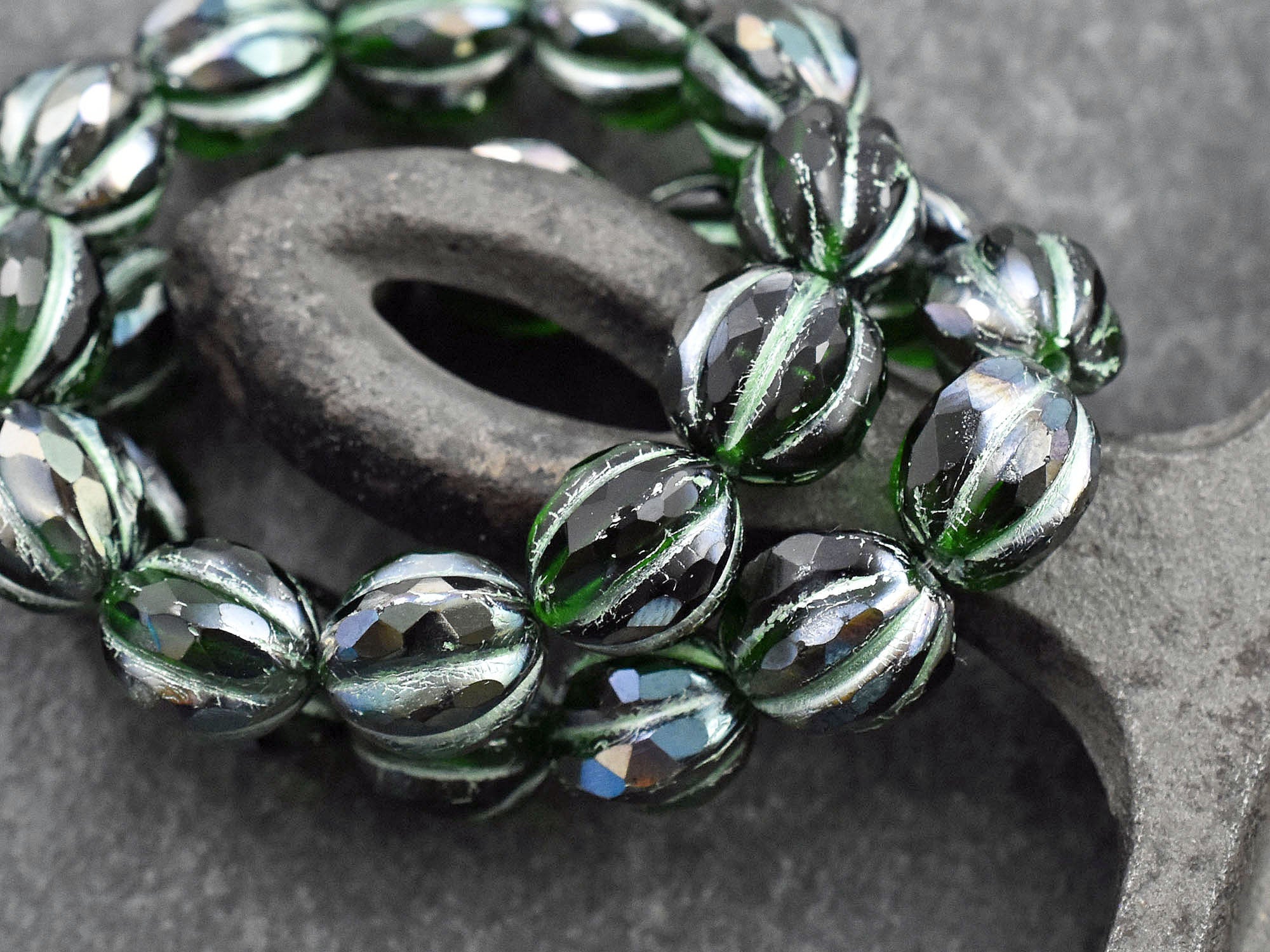 *12* 10mm Metallic Green Washed Emerald Green Faceted Round Melon Beads