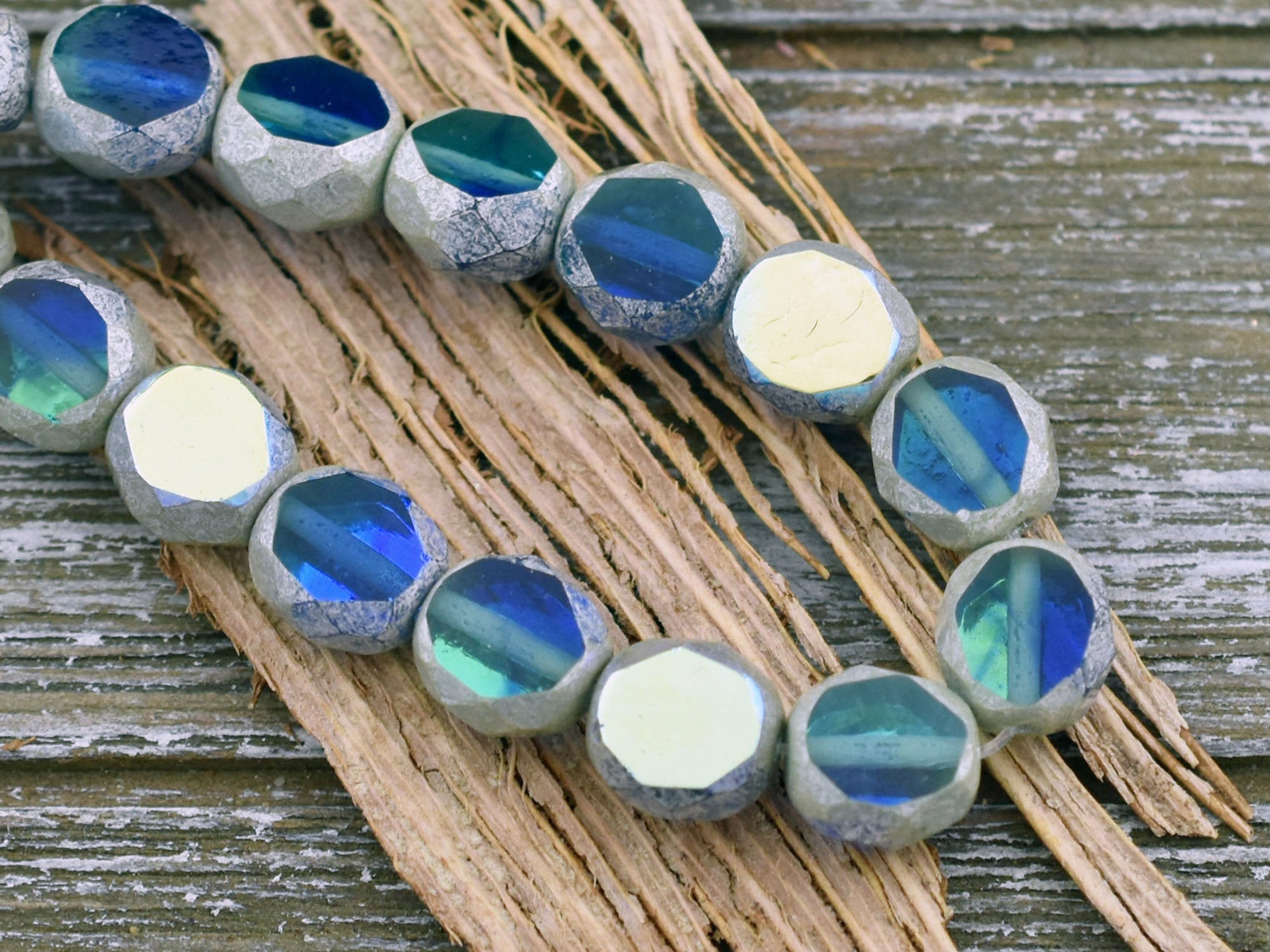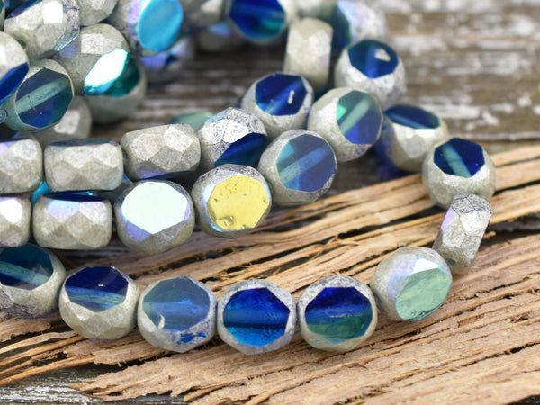 *15* 8mm Antique Silver Washed Sapphire Aqua AB 2 Cut Fire Polished Faceted Round Beads