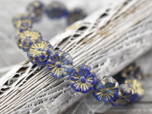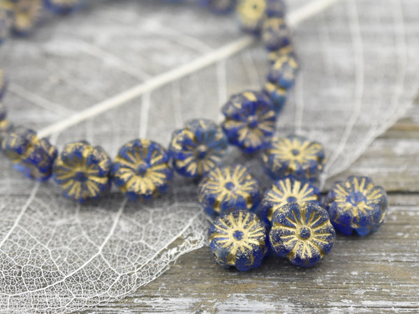 *16* 9mm Gold Washed Etched Sapphire Hawaiian Flower Beads