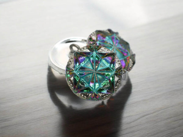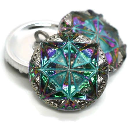 18mm Gem Button Vitrail Green with Sea Green and Silver Accents - Czech Glass Buttons