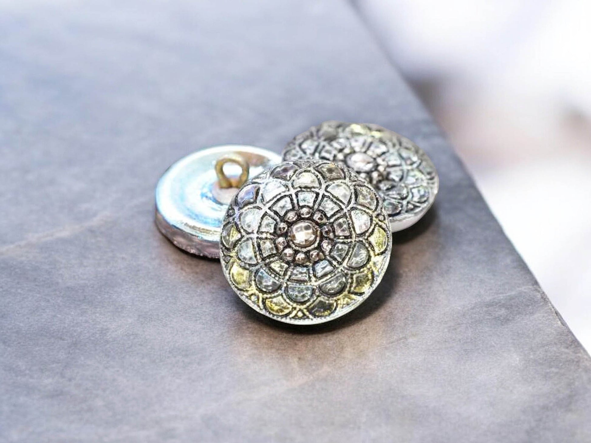 18mm Mandala Button Transparent Glass with a Black Wash, AB Finish, and Silver Accents - Czech Glass Buttons
