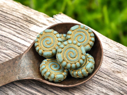 *6* 16mm Gold Washed Matte Turquoise Spiral Coin Beads