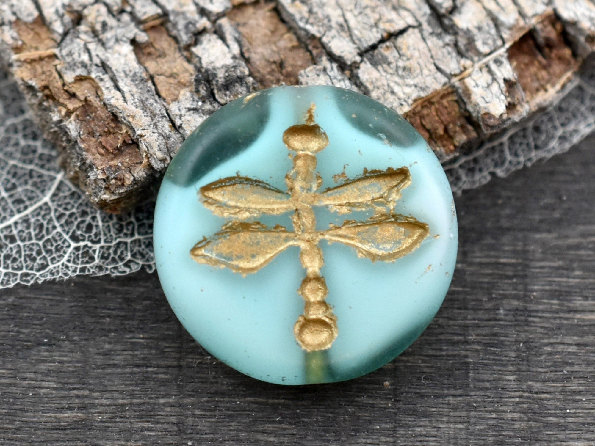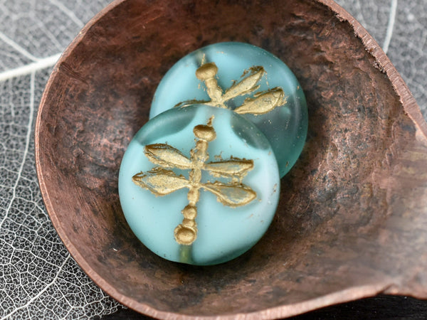 *4* 18mm Gold Washed Matte Green Aqua Cloud Dragonfly Coin Beads