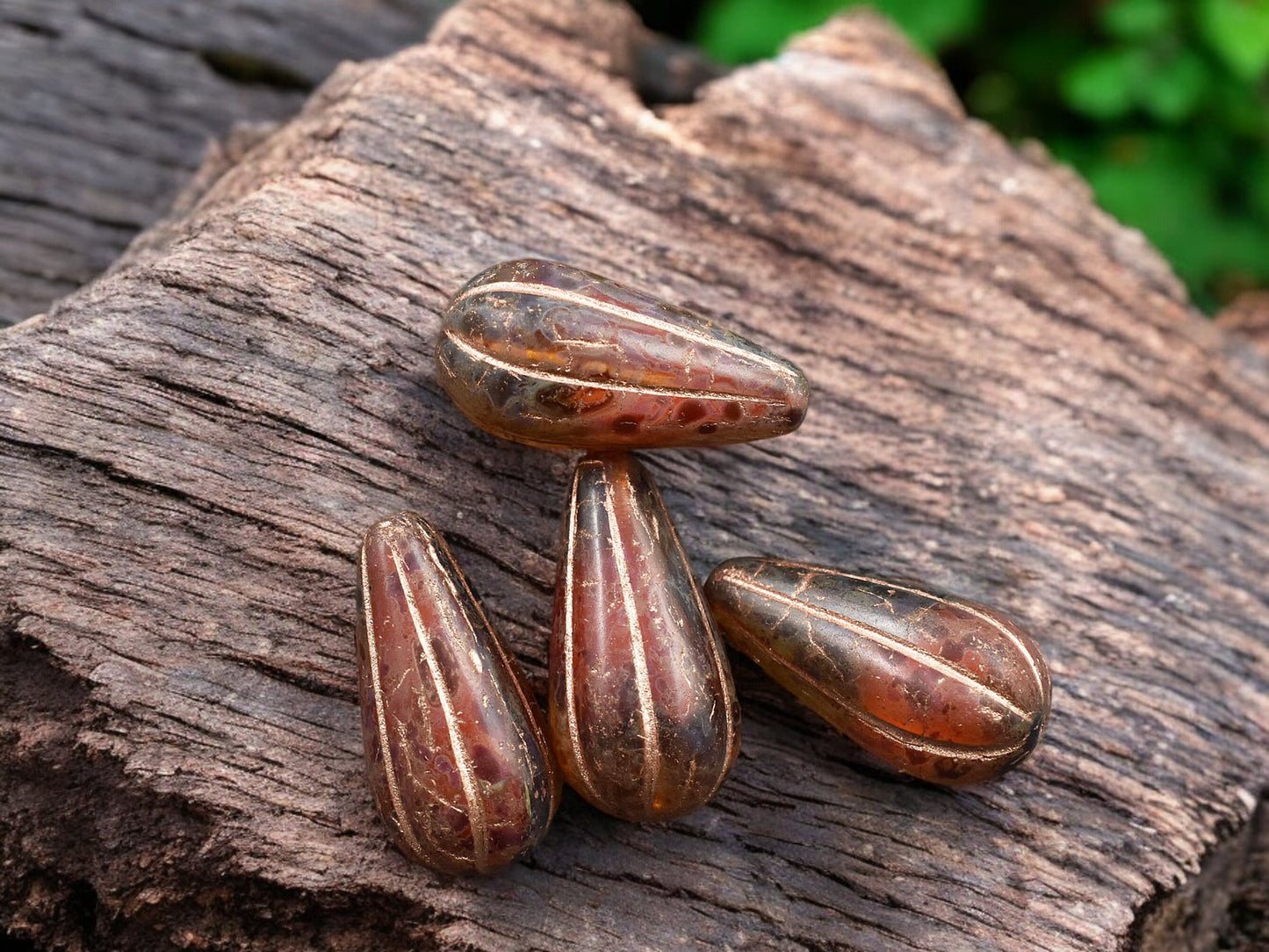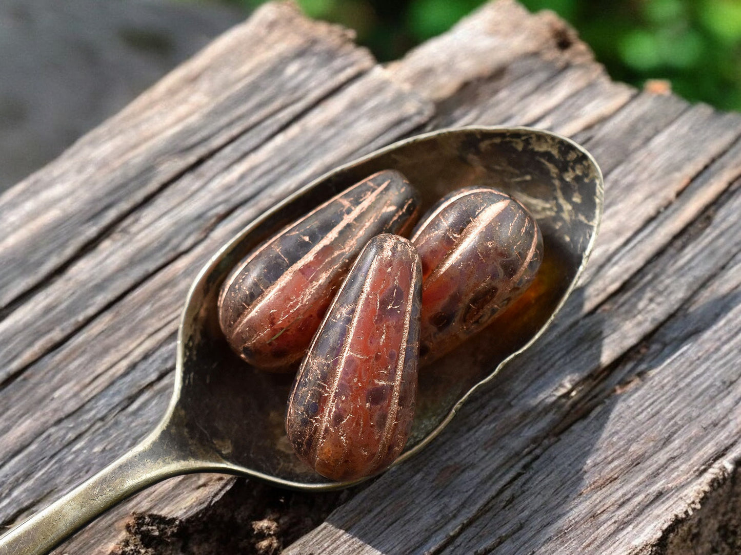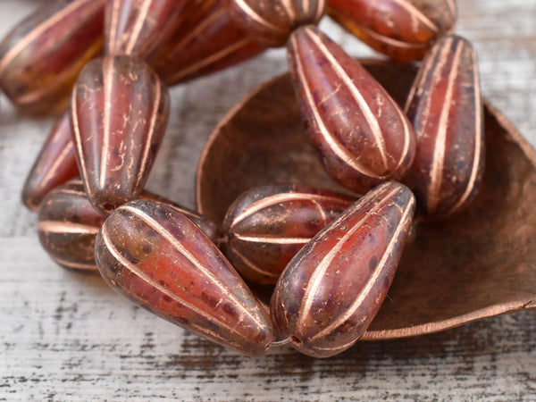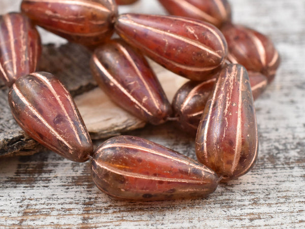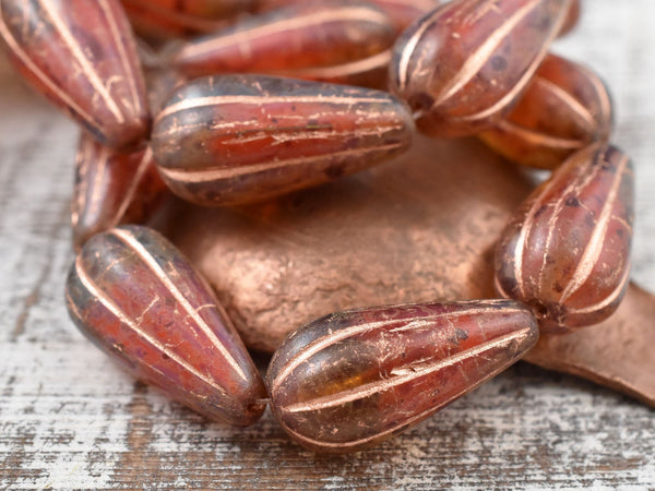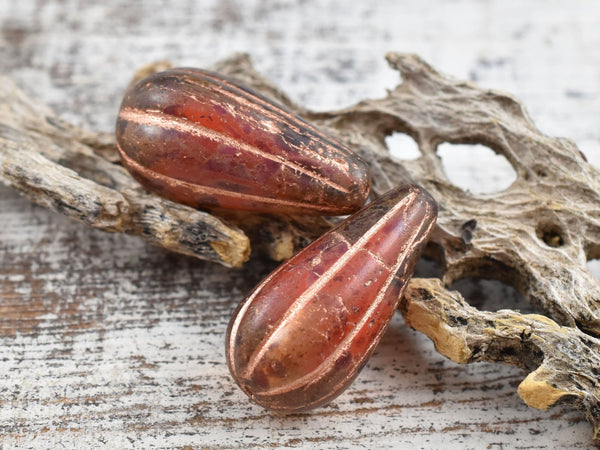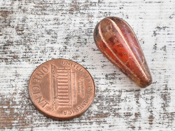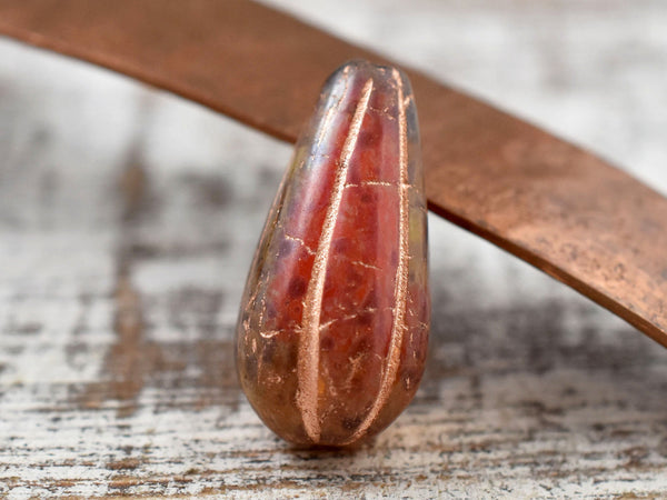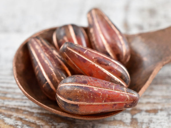 *6* 22x11mm Copper Washed Crimson Amber Picasso Melon Drop Beads
