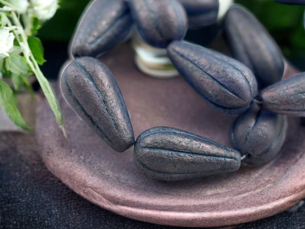 *6* 22x11mm Etched Matte Montana Blue Luster Melon Drop Beads