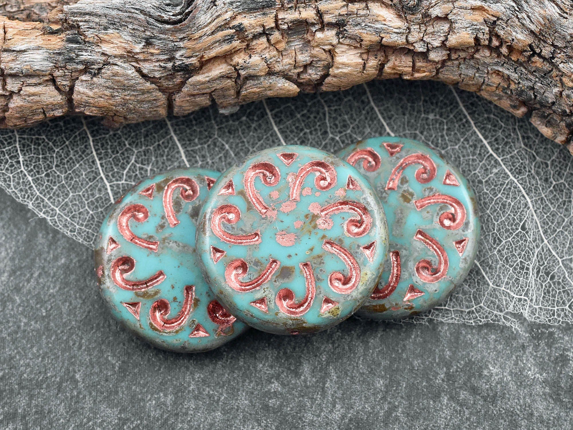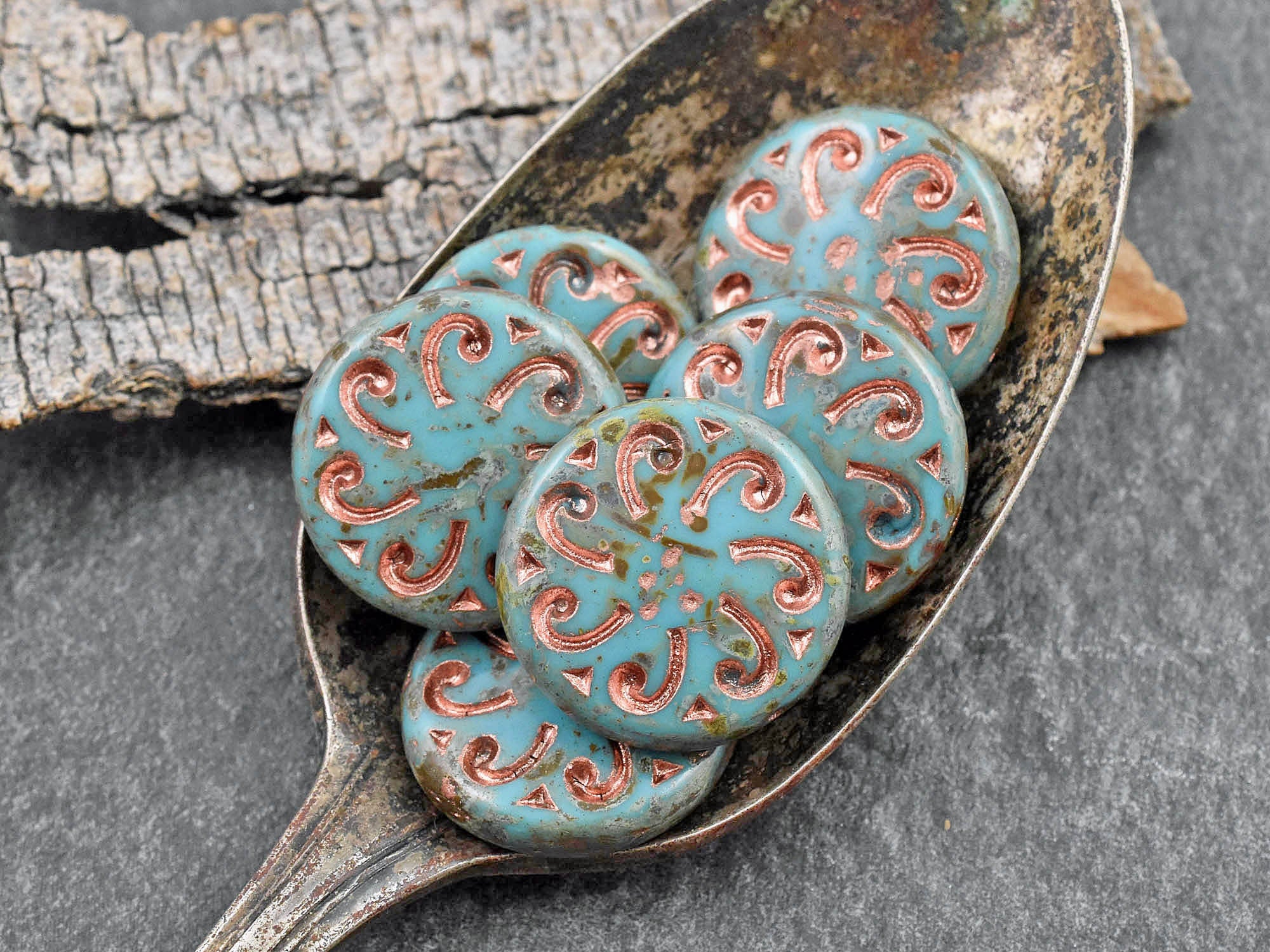 *2* 23mm Copper Washed Blue Turquoise Picasso Sun Coin Beads