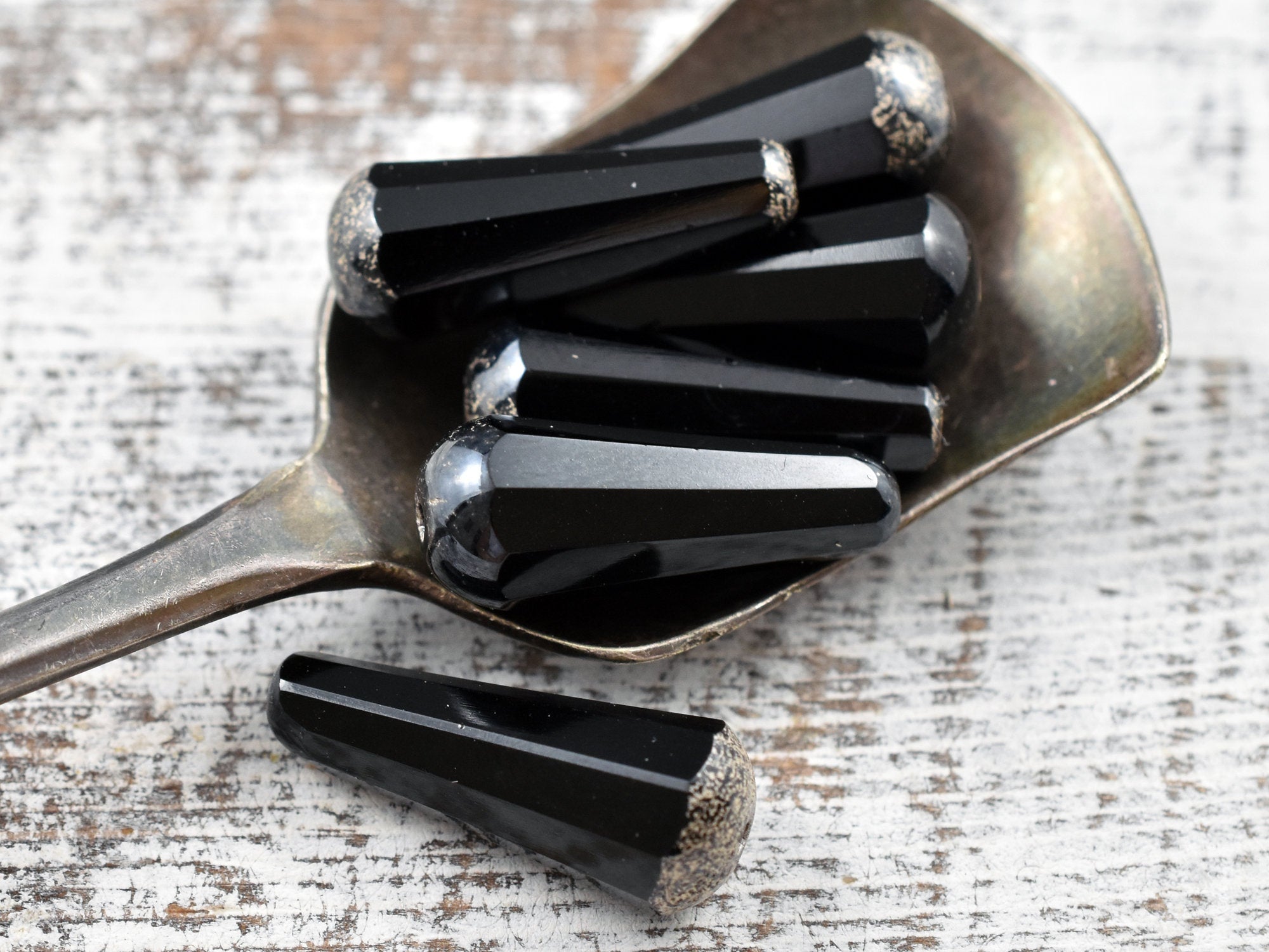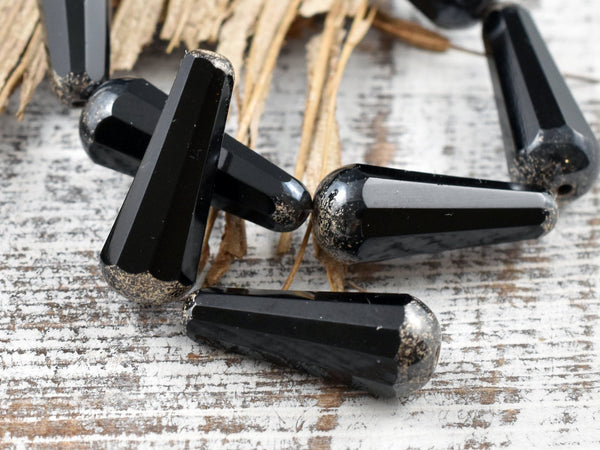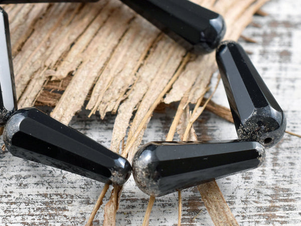 *6* 8x20mm Antique Silver Tipped Jet Black Faceted Drop Beads