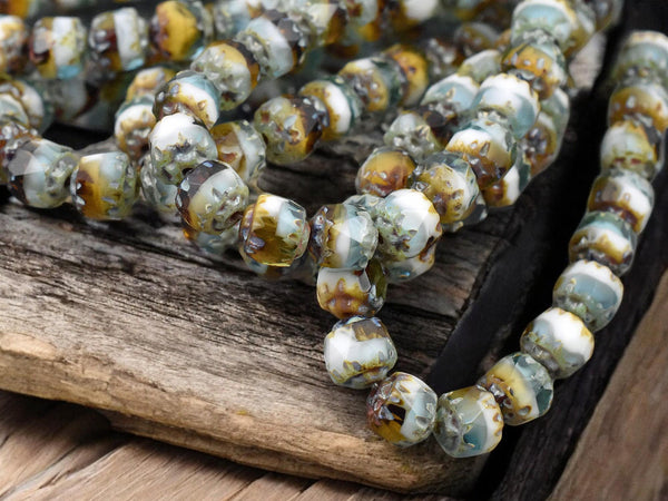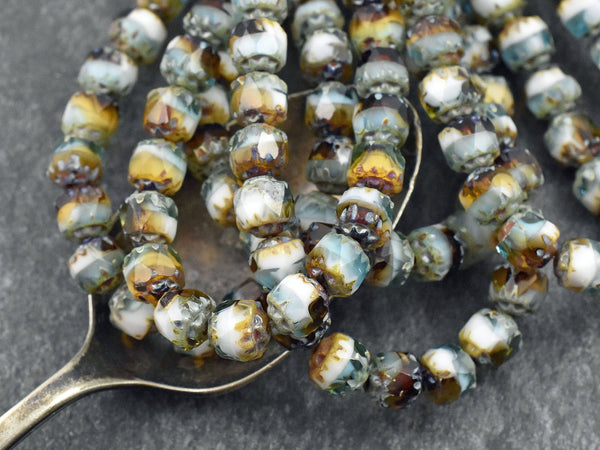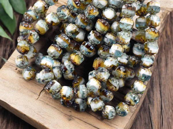 Blended White Topaz & Aqua Picasso Cathedral Beads - Choose Your Size