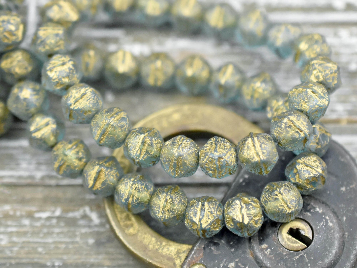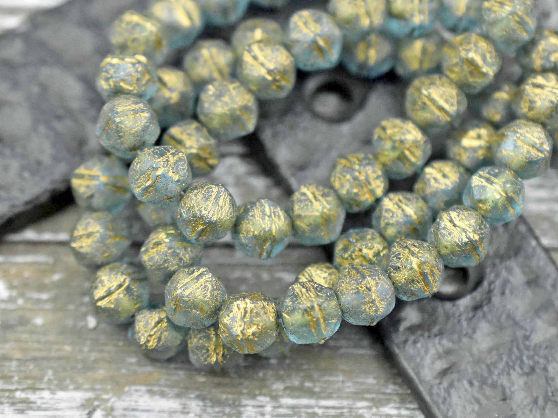 *20* 8mm Gold Washed Etched Blue Aqua Antique Cut Round Beads